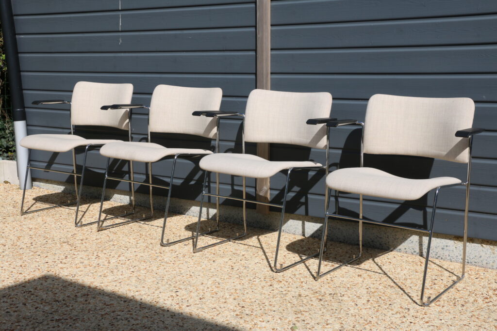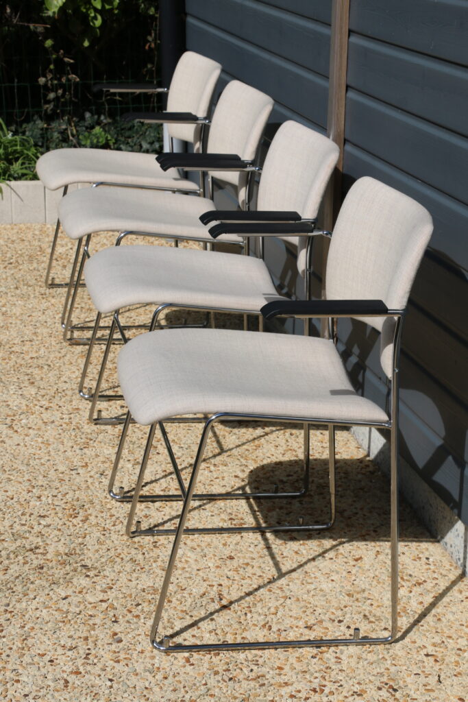 Siège et dossier en bois recouvert de tissu blanc chiné ; châssis en fil d’acier chromé; accoudoir plastique noir. Bon confort d’assise.