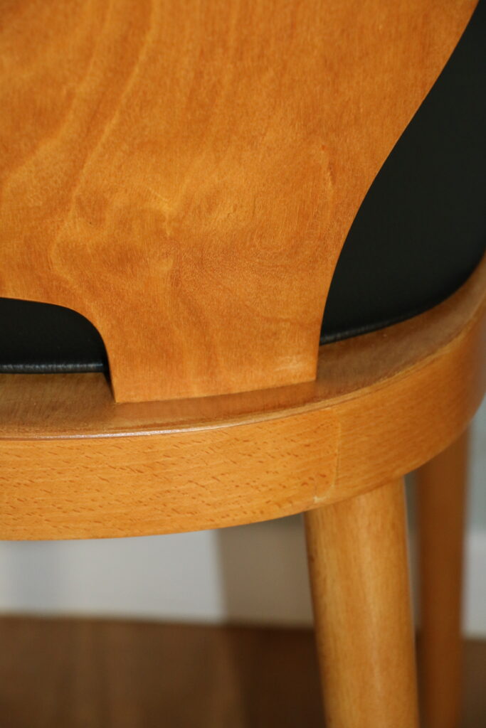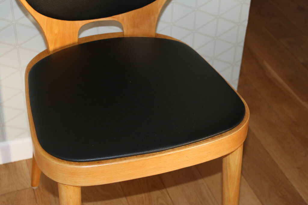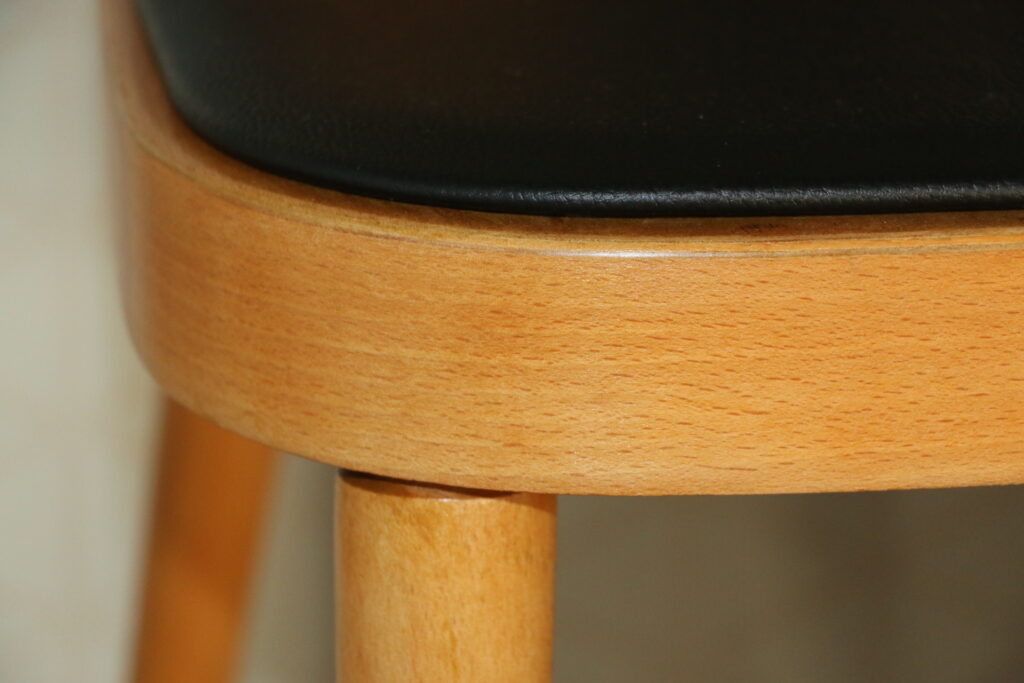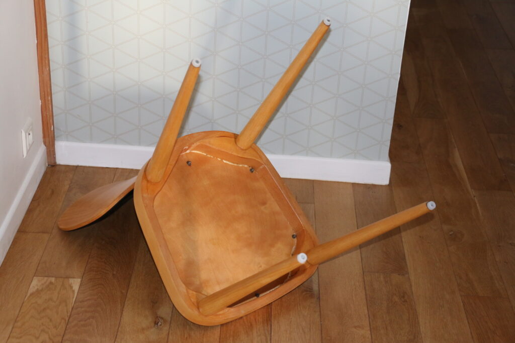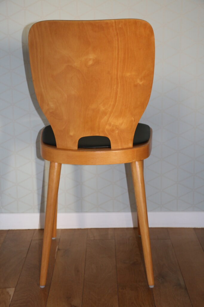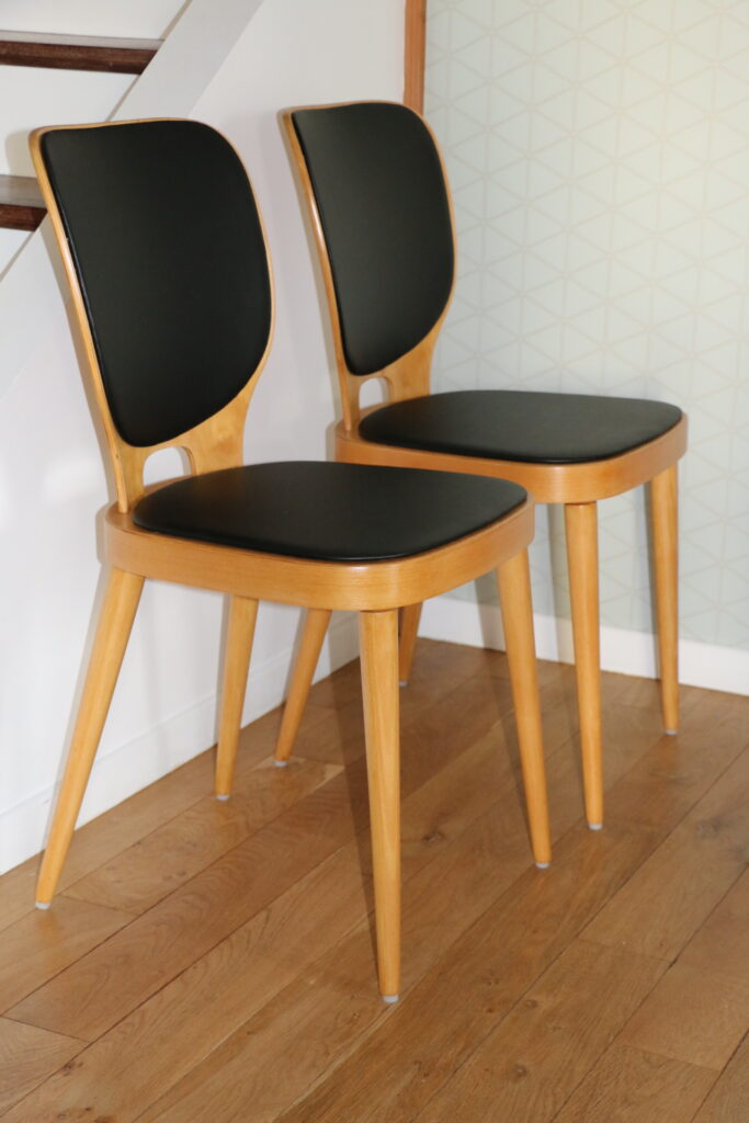 Très bon état structurel et cosmétique (belle patine ; skaï refait à neuf ; chaises entièrement poncée puis protégée par un vitrificateur hêtre clair) ; tampons piètement neuf et adaptés à toute surface