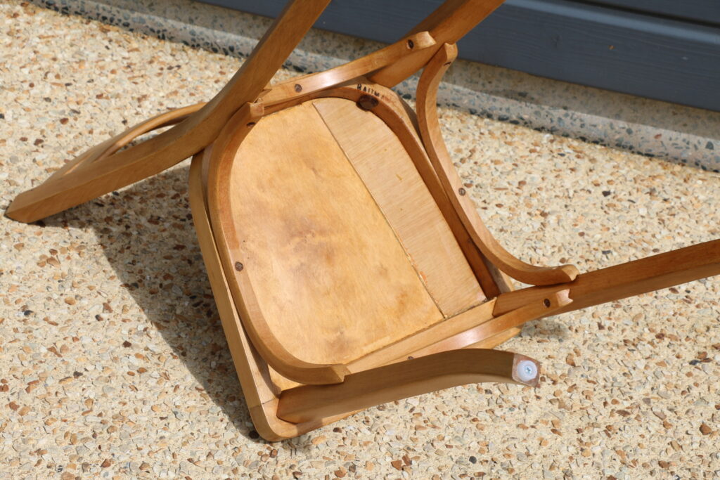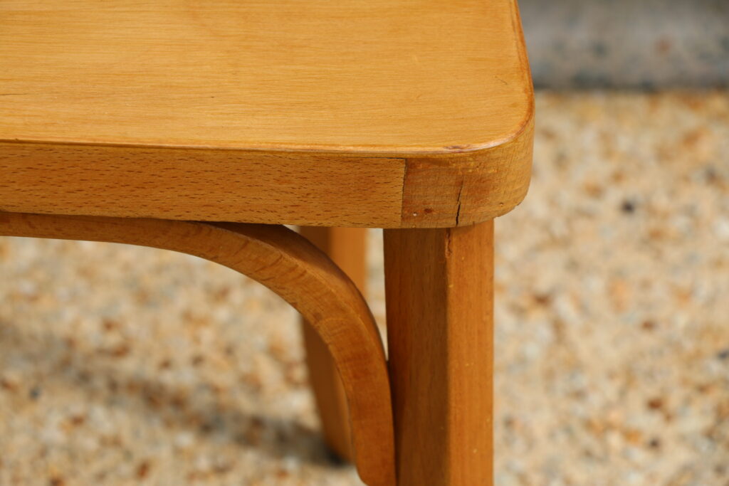Très bon état structurel et cosmétique (belle patine ; chaises entièrement poncées puis protégées par un vitrificateur hêtre clair ; quelques trous de vrillettes traités et rebouchés , une chaise a été renforcé sous l’assise par mesure de précaution ce qui la rendu plus solide qu’à l’origine) ; tampons piètement neuf et adaptés à toute surface