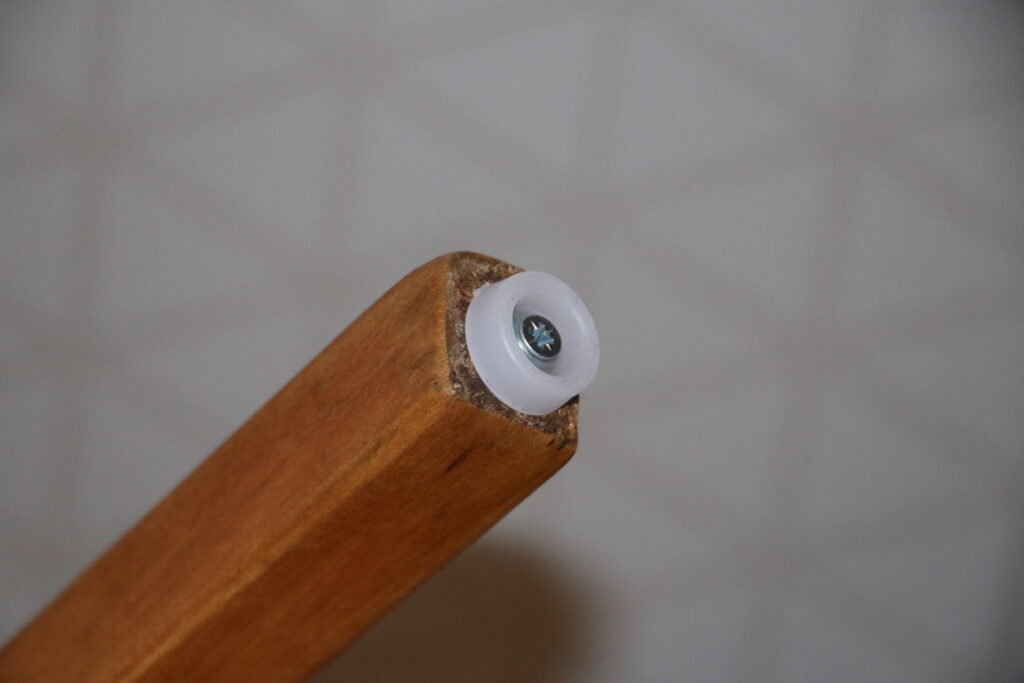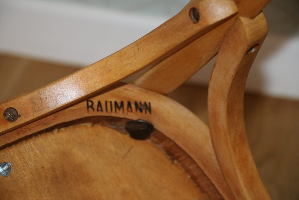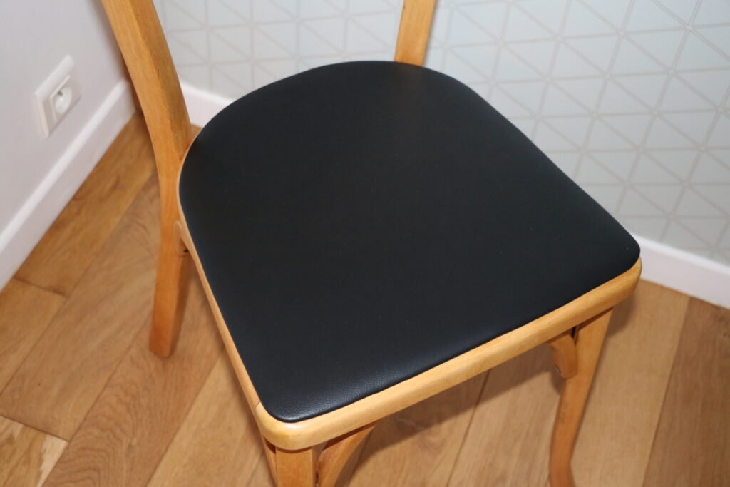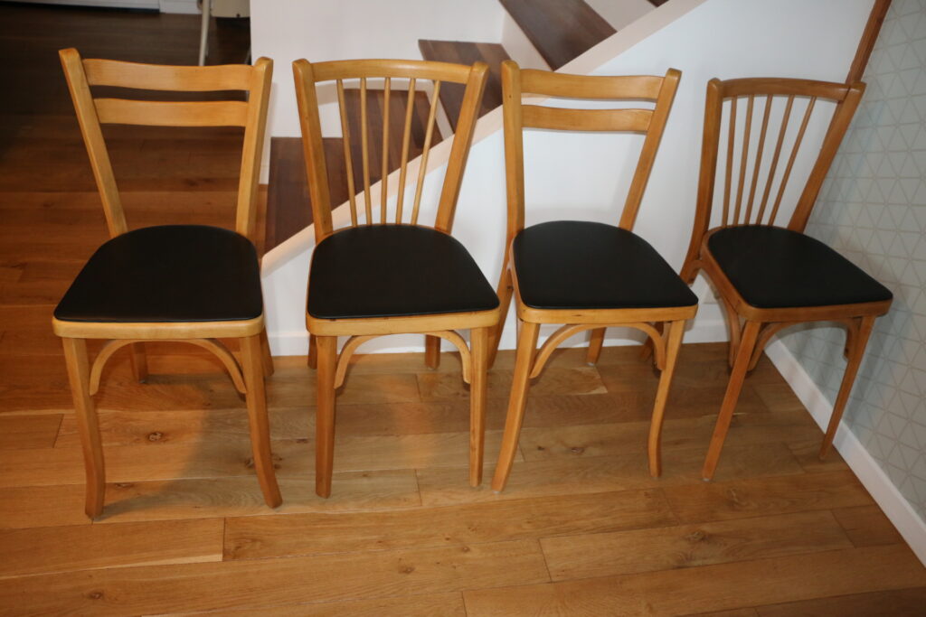 Très bon état structurel et cosmétique (belle patine ; chaises entièrement poncées puis protégées par un vitrificateur hêtre clair. Assise doté d’une galette bois, doublée d’une très fine mousse et recouverte d’un vinyle noire ; tampons piètement neuf et adaptés à toute surface