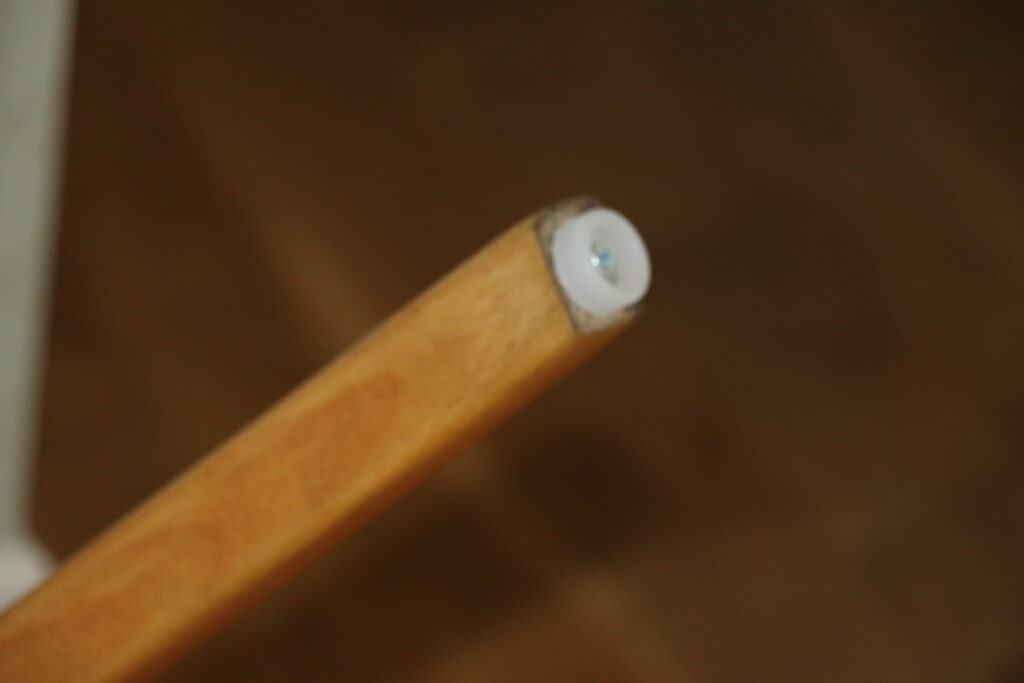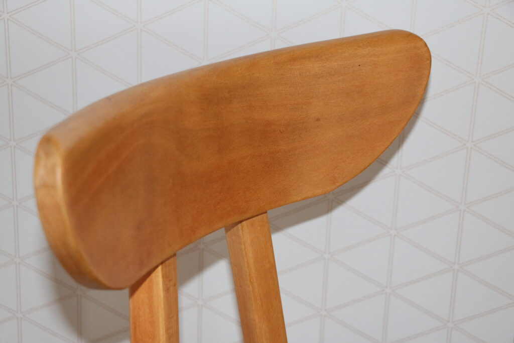 Très bon état structurel et bon état cosmétique (chaises entièrement poncées puis protégées par un vitrificateur hêtre clair) ; skaï refait ; tampons piètement neufs adaptés à toute surface