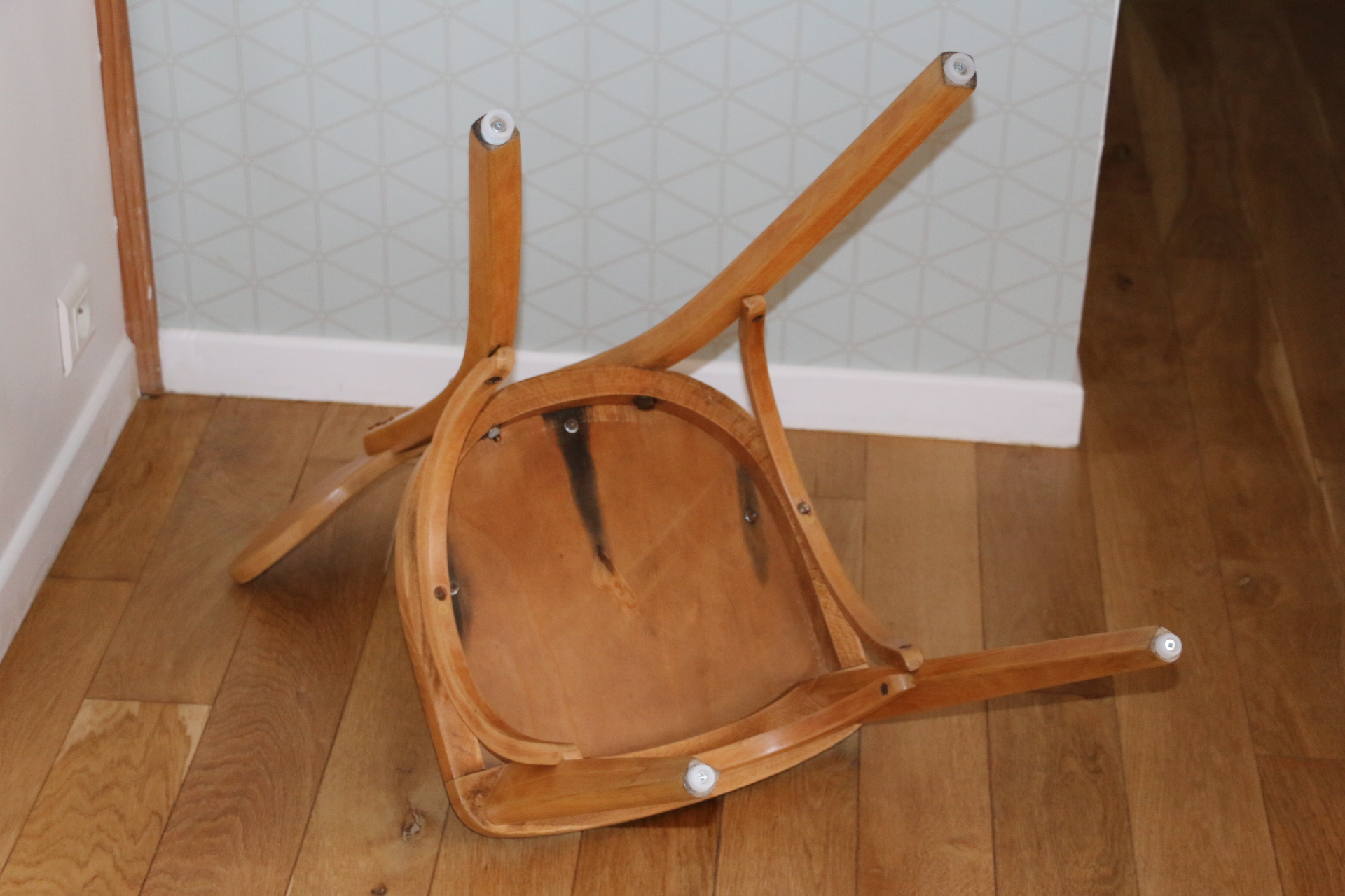 Très bon état structurel et bon état cosmétique (chaises entièrement poncées puis protégées par un vitrificateur hêtre clair) ; skaï refait ; tampons piètement neufs adaptés à toute surface
