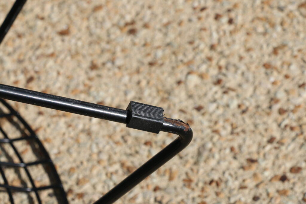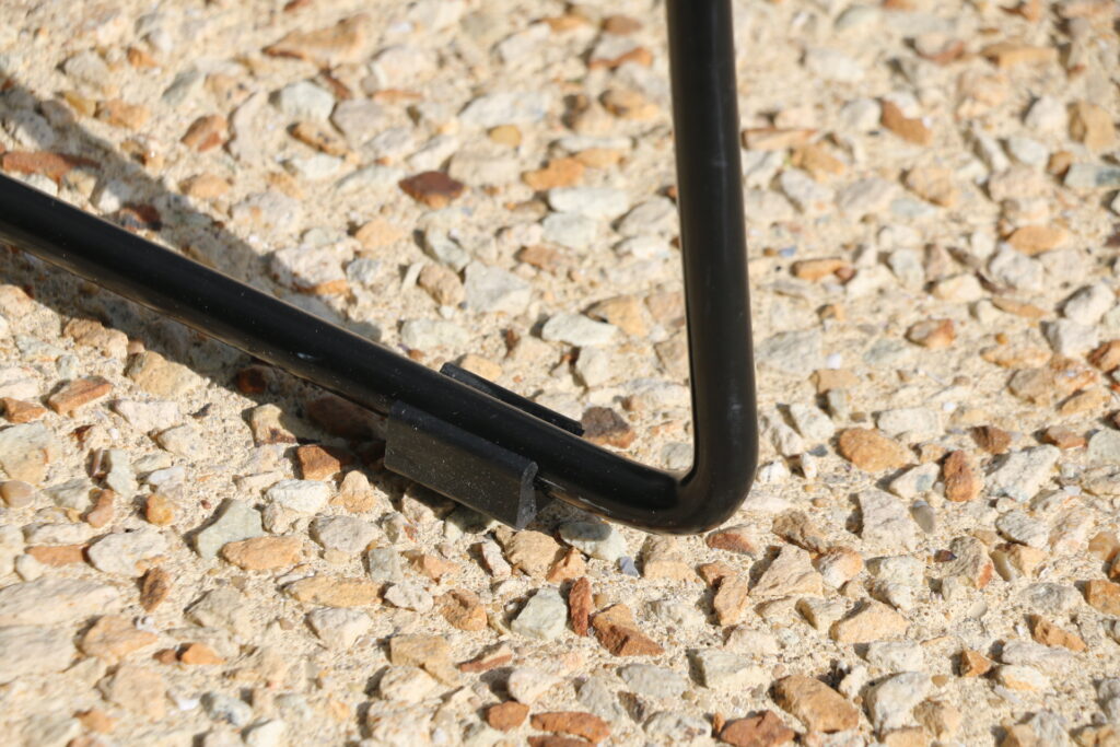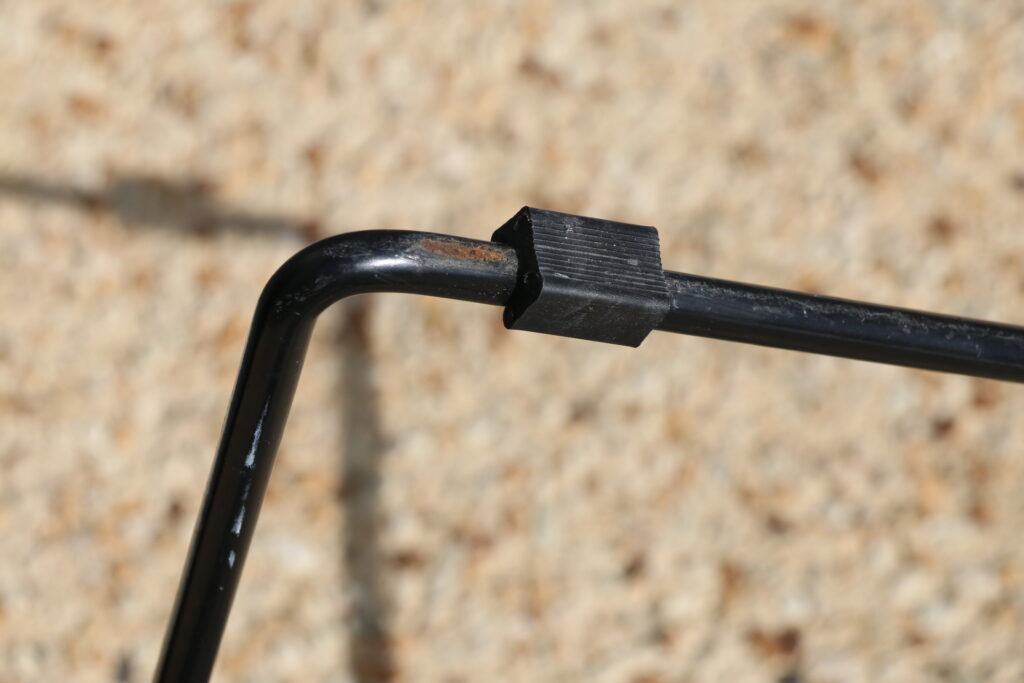 Le modèle proposé ici est en très bon état (pas de saute de soudure ; rilsan en bel état général ; quelques manques de rilsan non visibles sous le piètement dus à l’absence de tampons et au frottement des chaises sur le sol ; tampons plastiques clipsables rapportés sur deux des trois chaises)