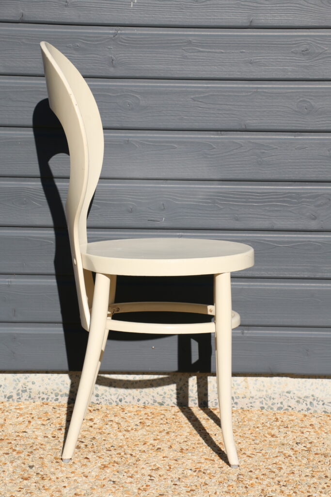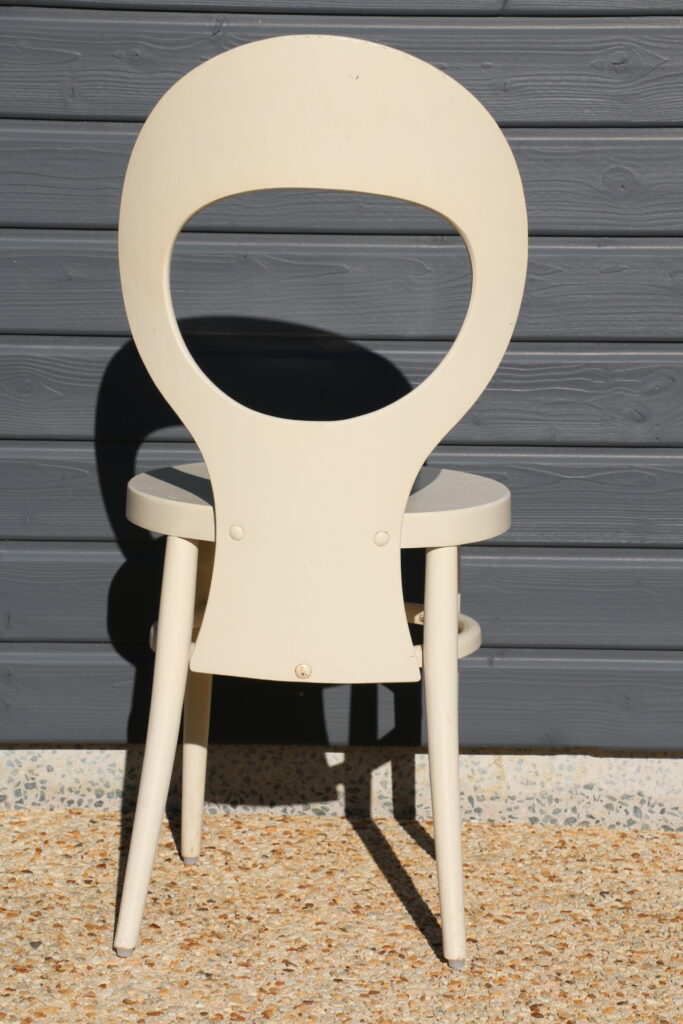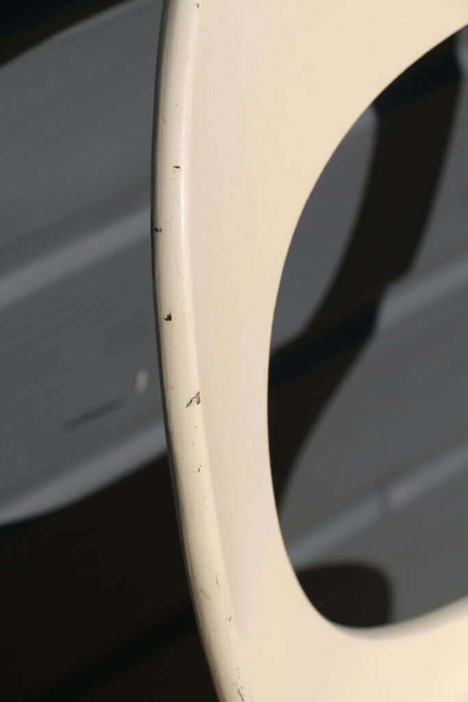 Structure en bois moulé (9 épaisseurs) , structure blanche (peinture d’origine) ; embouts de pieds neufs adaptés à toute surface afin d’éviter les rayures