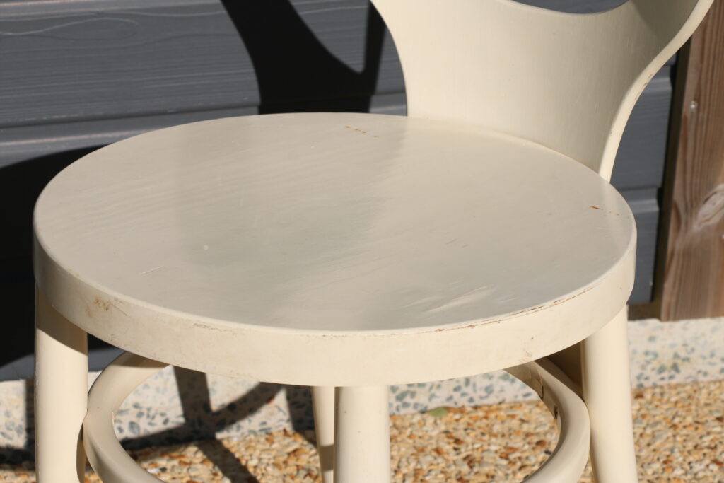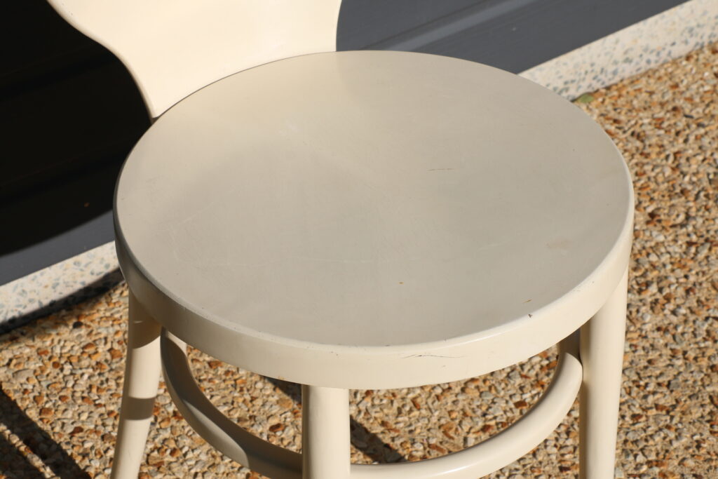 Chaises en très bon état structurel (chaises démontées, vérifiées et remontées) , état cosmétique d’usage (la peinture présente des traces d’usage et des manques ; une chaise présente un gondolage localisé et non évolutif sur l’assise)