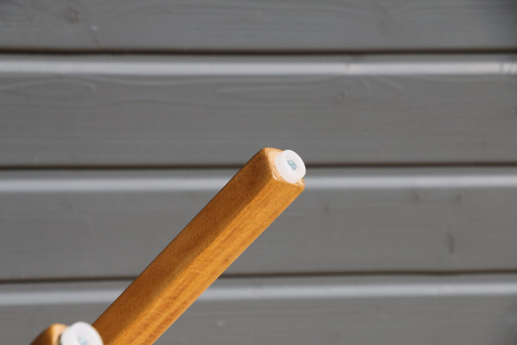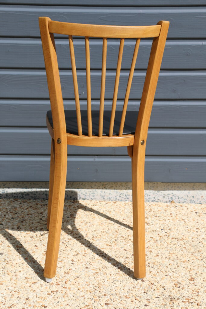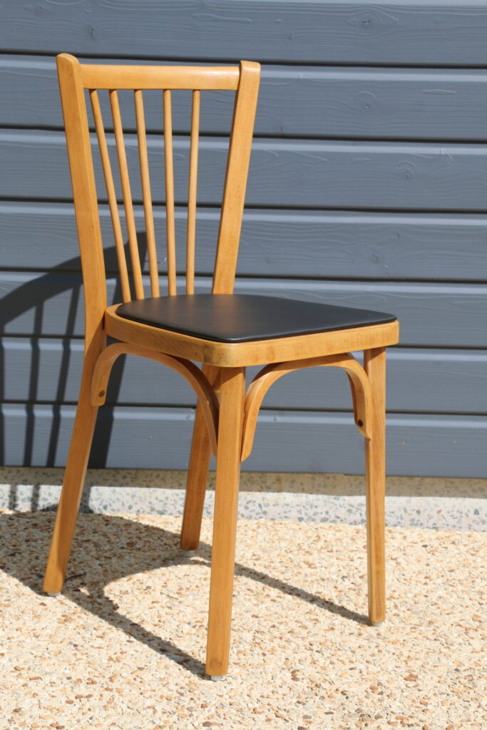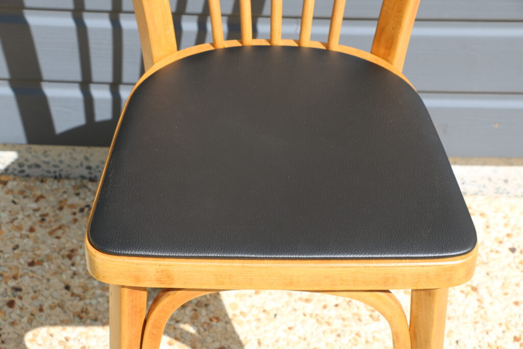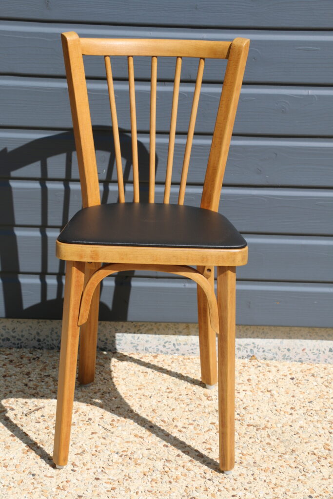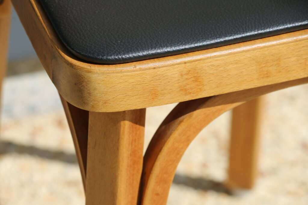 Coloris hêtre clair (l’ensemble a été poncé puis protégé par un vitrificateur) ; galettes skaï noir (skaï refait à neuf) ; tampons toutes surfaces neufs sur chaque piètement