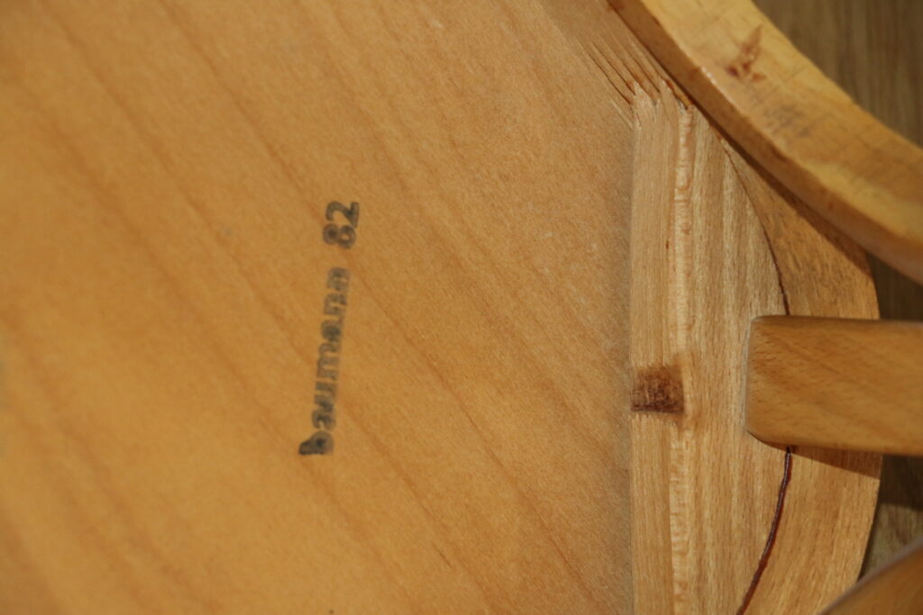 Très bon état structurel et cosmétique (vernis d’origine ; belle patine ; quelques manques sans incidence sur le dossier d’une chaise) ; tampons caoutchouc blancs anciens sur le piètement