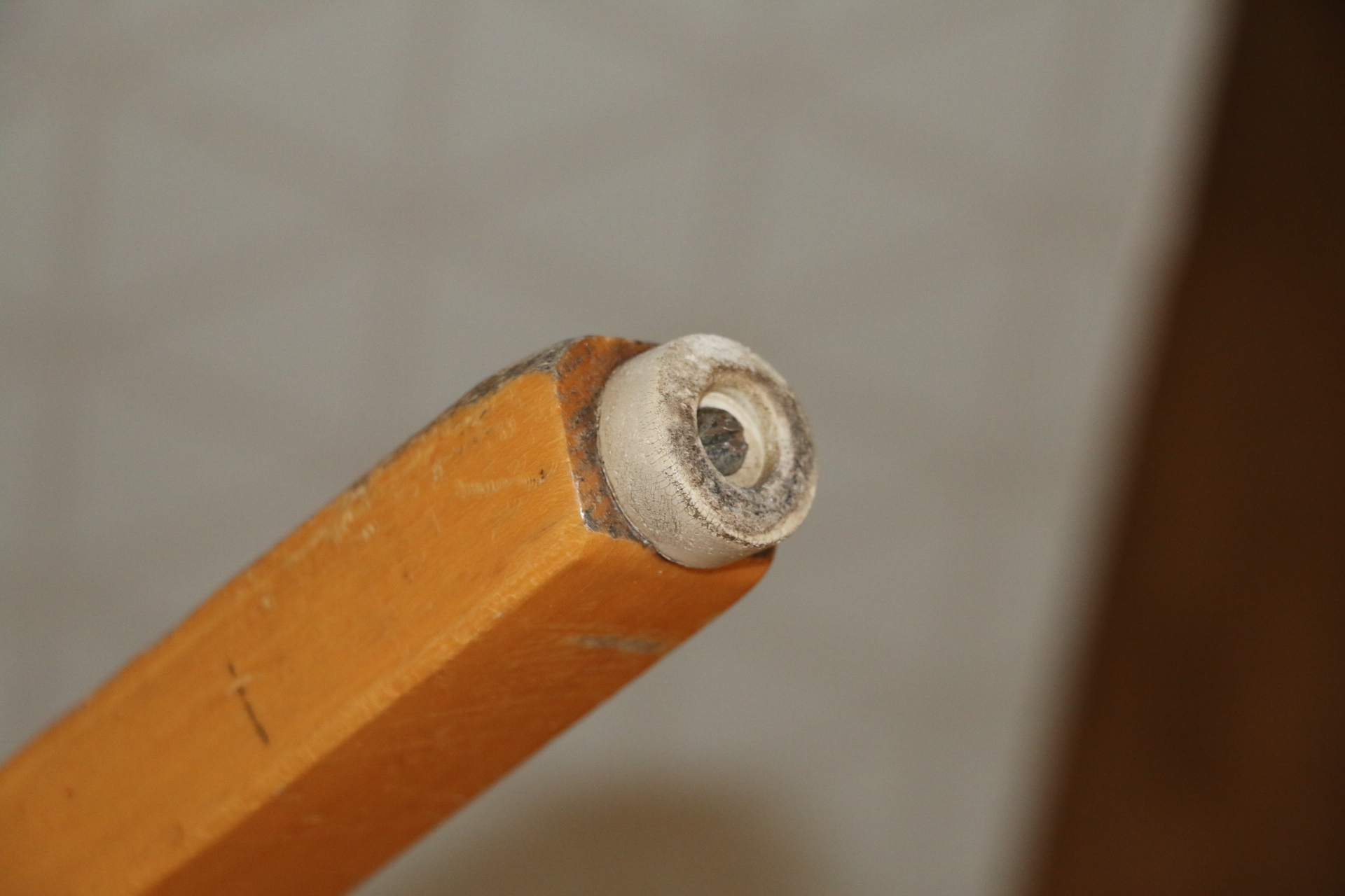Très bon état structurel et cosmétique (vernis d’origine ; belle patine ; quelques manques sans incidence sur le dossier d’une chaise) ; tampons caoutchouc blancs anciens sur le piètement