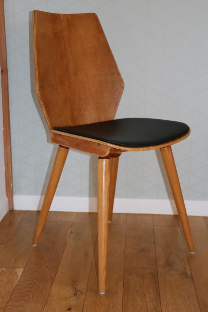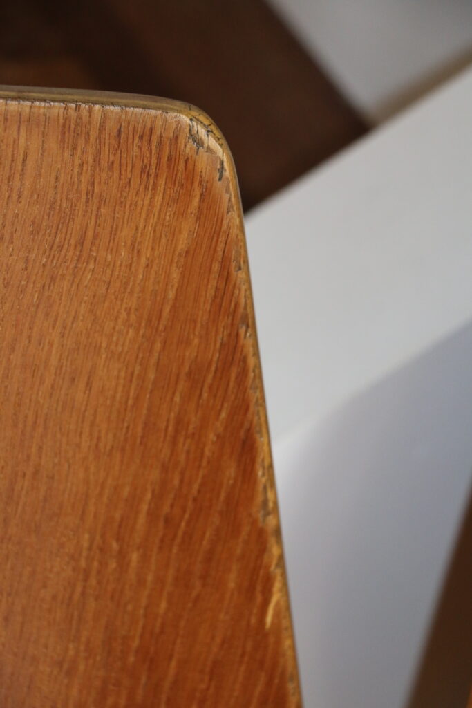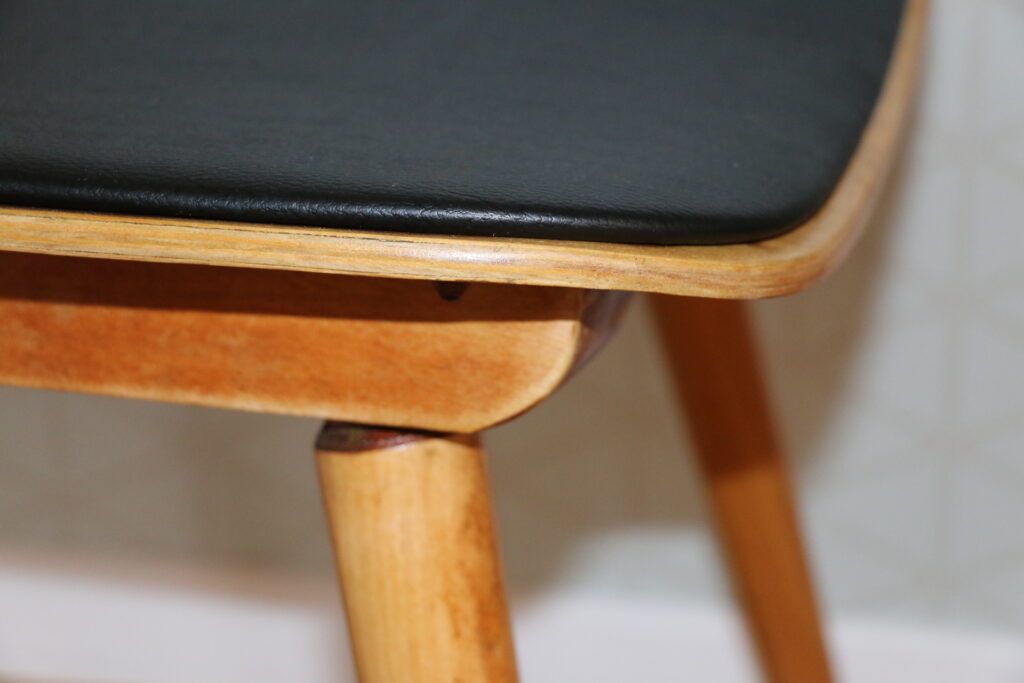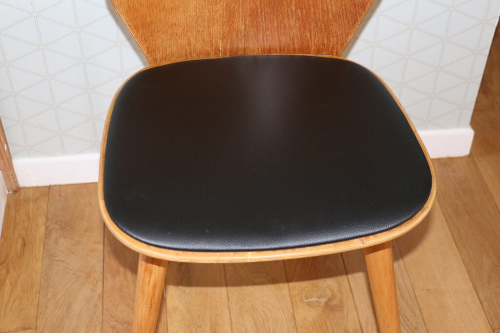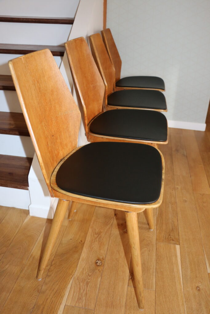 Bon état structurel et cosmétique (belle patine ; skaï refait à neuf ; chaises entièrement poncée puis protégée par un vitrificateur hêtre clair ; les chaises présentent plusieurs restaurations de placage sur les dossiers) ; tampons piètement neuf et adaptés à toute surface
