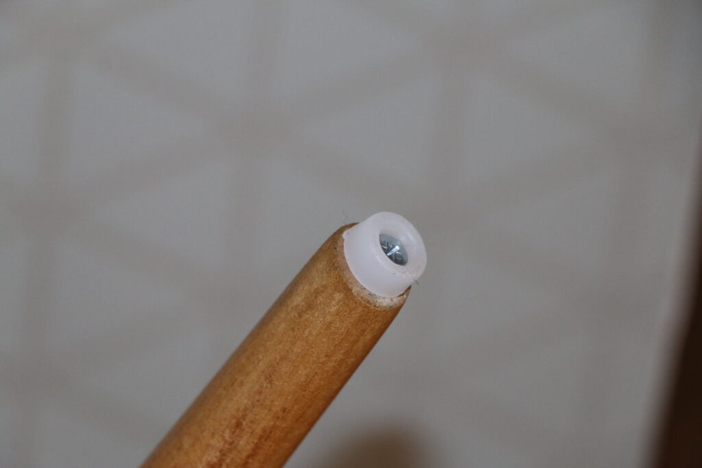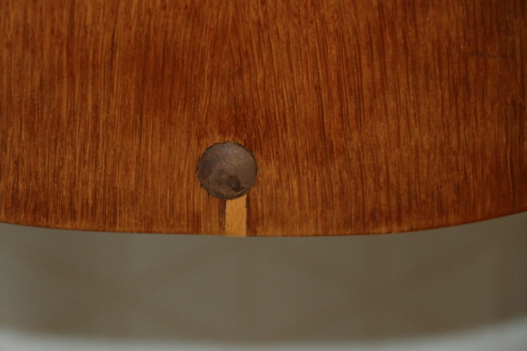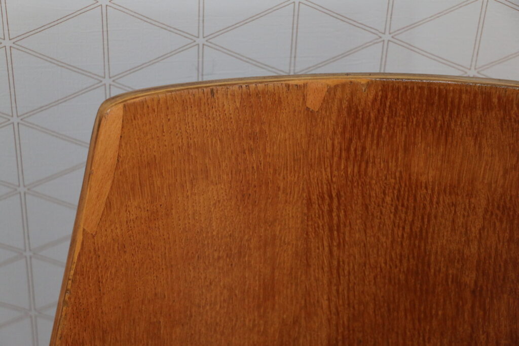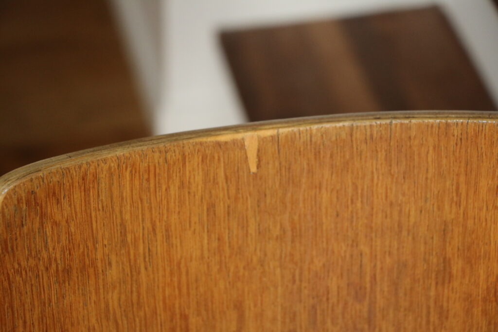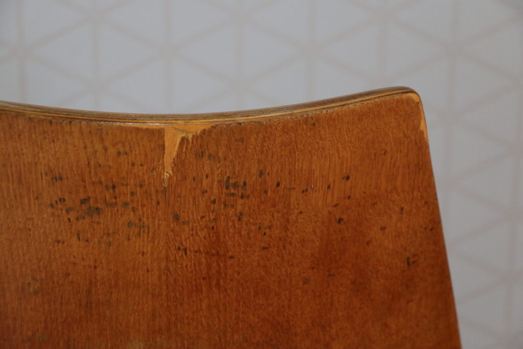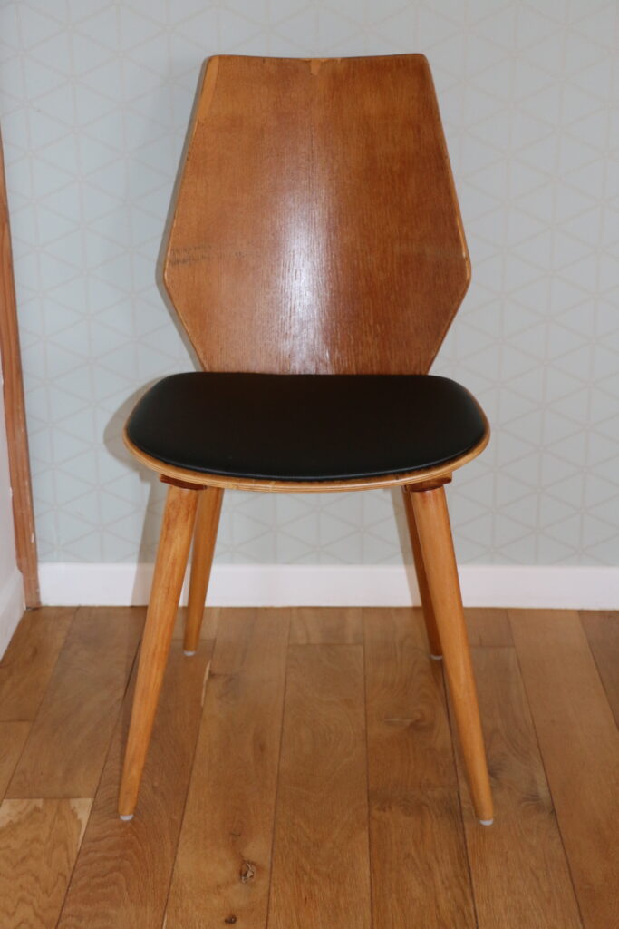 Bon état structurel et cosmétique (belle patine ; skaï refait à neuf ; chaises entièrement poncée puis protégée par un vitrificateur hêtre clair ; les chaises présentent plusieurs restaurations de placage sur les dossiers) ; tampons piètement neuf et adaptés à toute surface