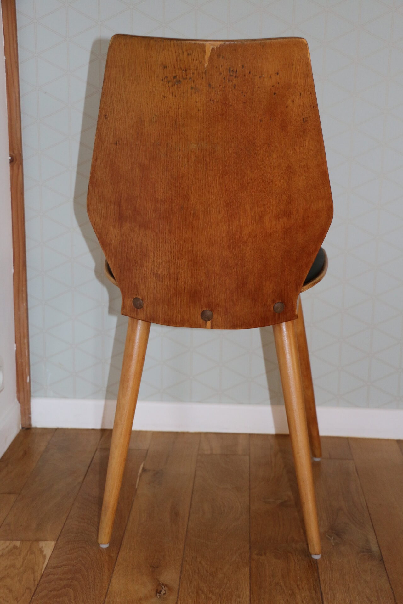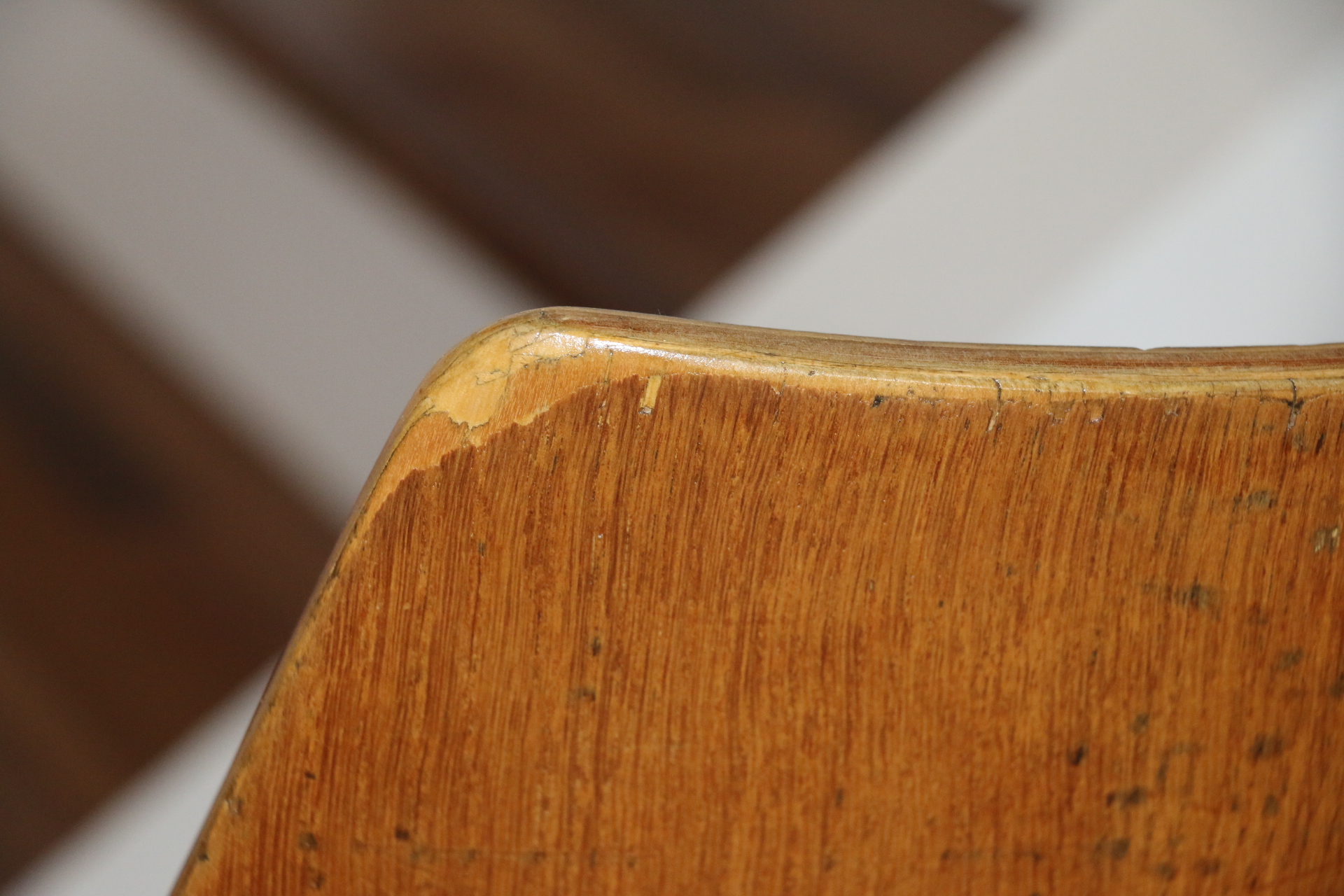 Bon état structurel et cosmétique (belle patine ; skaï refait à neuf ; chaises entièrement poncée puis protégée par un vitrificateur hêtre clair ; les chaises présentent plusieurs restaurations de placage sur les dossiers) ; tampons piètement neuf et adaptés à toute surface