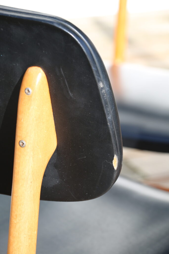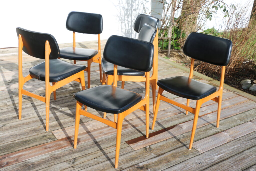 Chaises en très bon état (skaï en bel état général ; le skaï présente un très léger manque sur le dossier d’une chaise ; quelques traces d’usage ; bois doté du vernis d’origine présentant quelques traces d’usage)