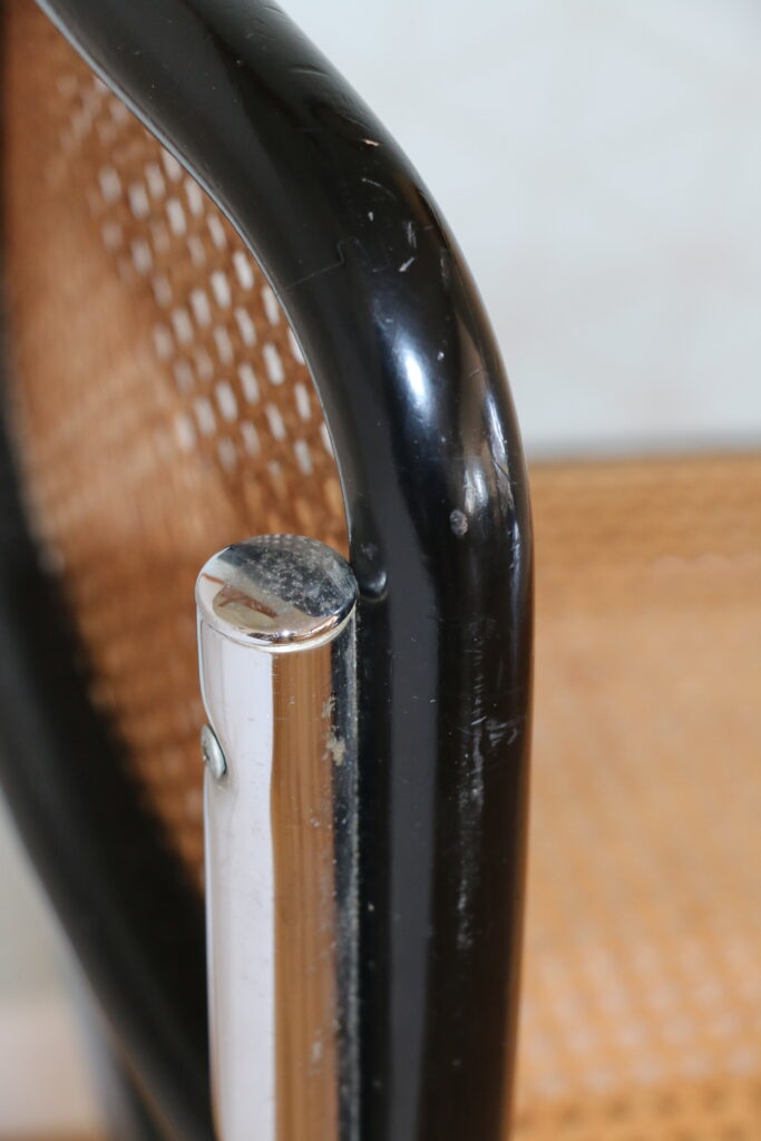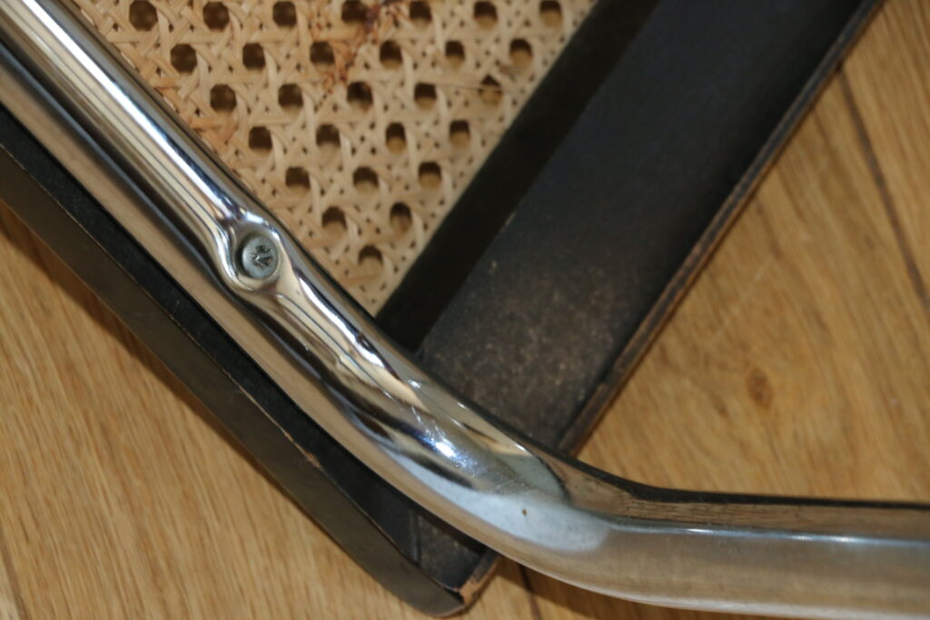 Assise très confortable ; état d’usage (le cannage de l’assise est en excellent tat, bien tendu et ne présente pas d’accroc ou de trou) ; chrome en bel état