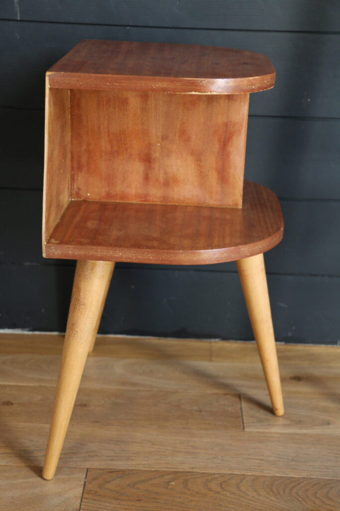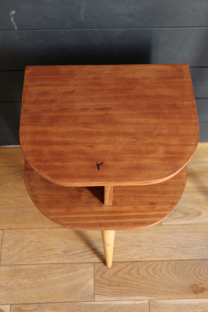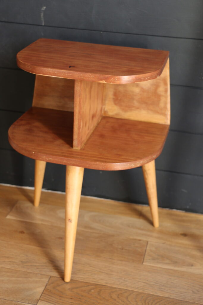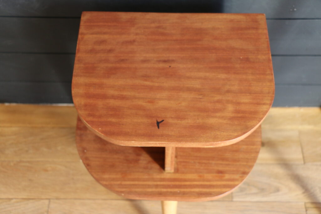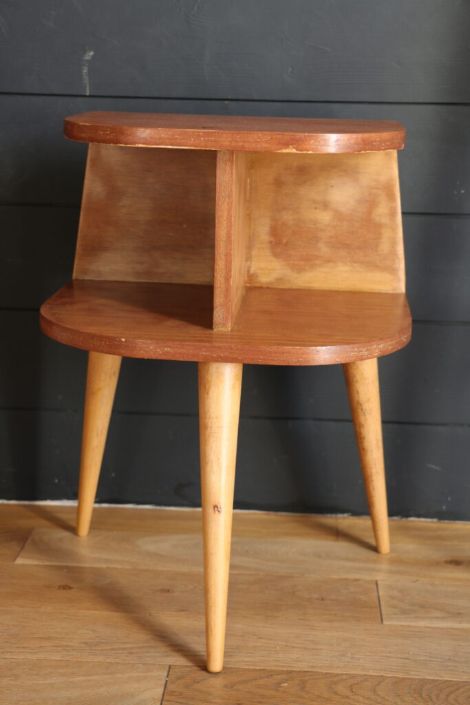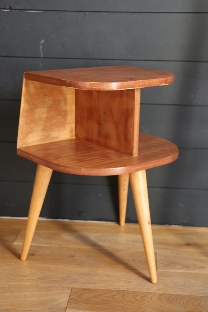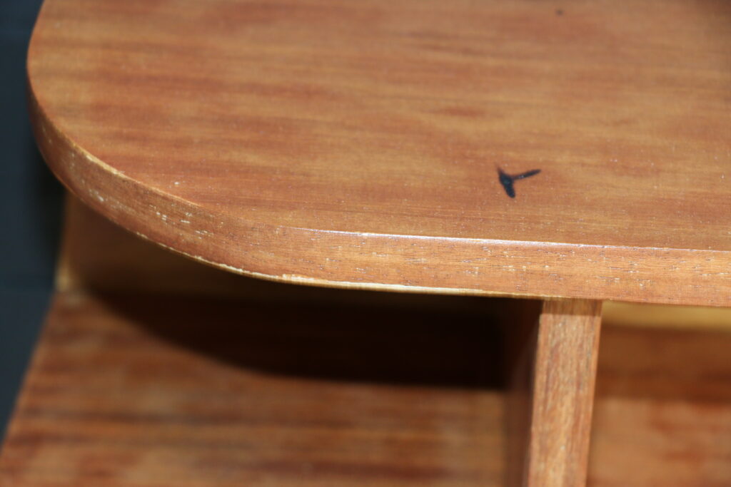 Bon état structurel (l’ensemble a été poncé puis vitrifié avec un vitrificateur professionnel aspect hêtre clair) ; quelques manques de placage discrets ; quelques traces blanches résiduelles