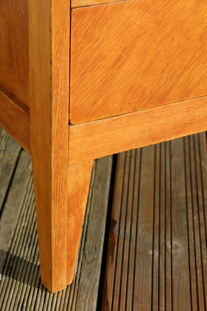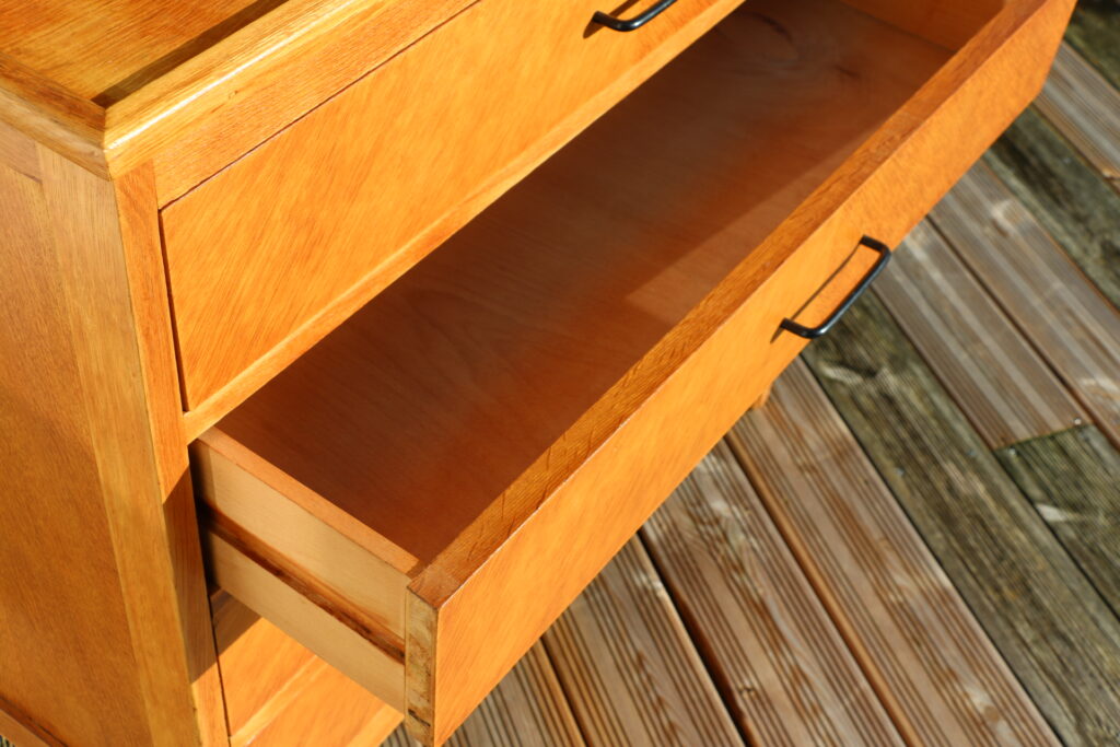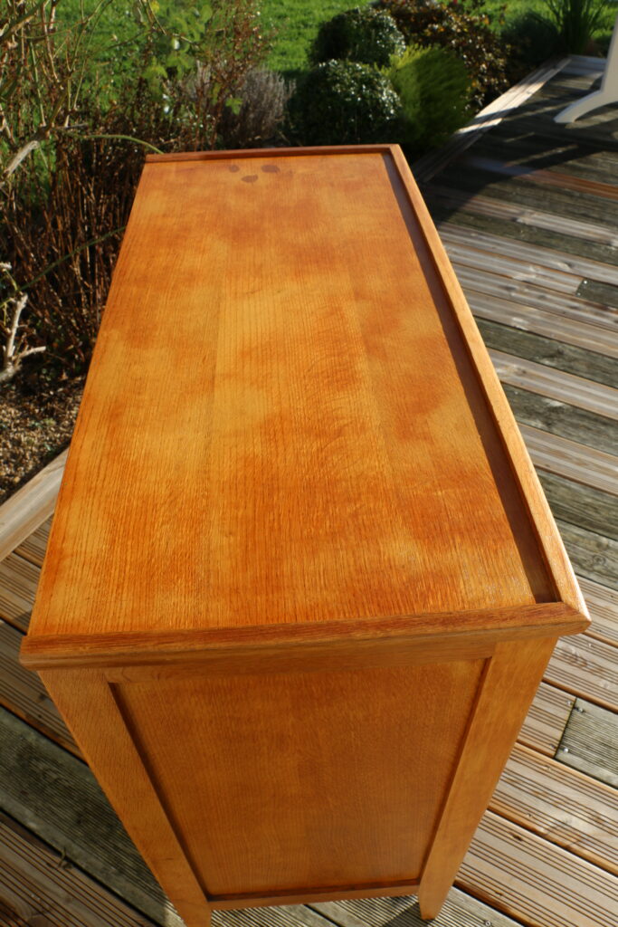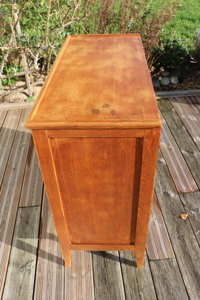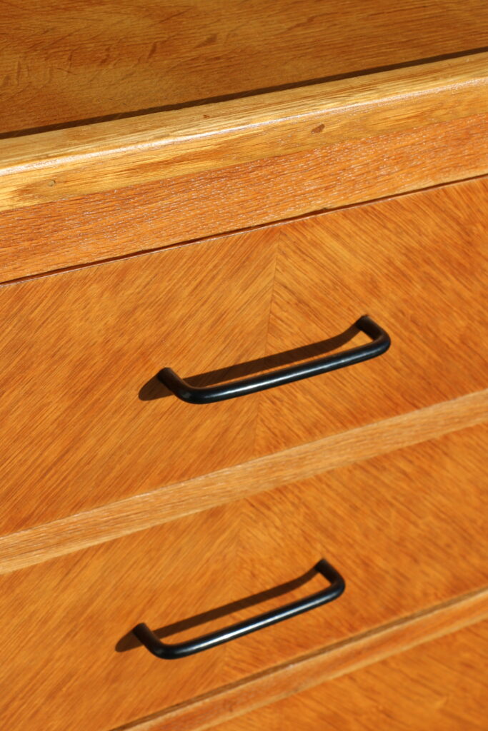 Modèle en bon état général (l’ensemble a été poncé puis vitrifié avec un vitrificateur professionnel aspect mat hêtre clair) ; deux tiroirs accrochent un peu et grince (n’empêche pas la bonne utilisation du modèle)