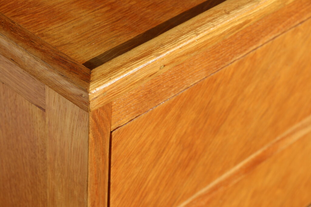 Structure et tiroir en chêne massif ; panneau et dessus en plaqué chêne ; poignées en acier et plastique noir