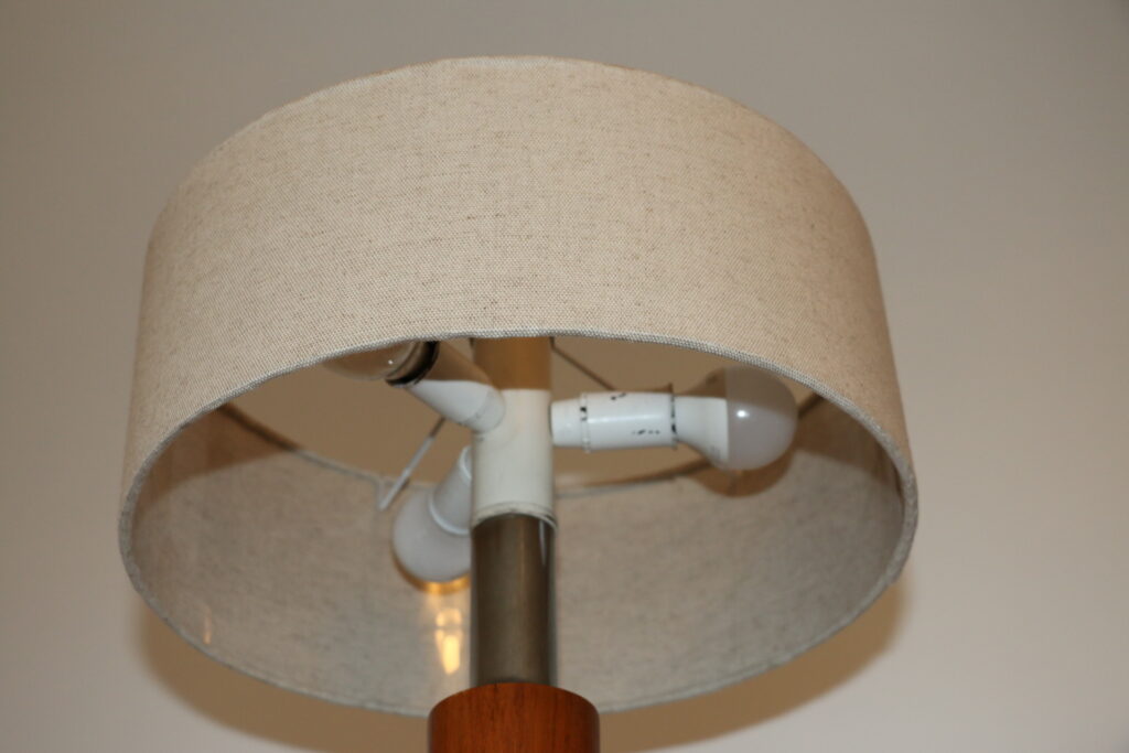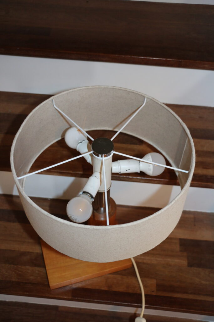 Lampe de belle facture équipée de trois douilles plastique E14 à visser ; câble électrique avec interrupteur en parfait état de fonctionnement ; abat-jour tissu crème ;