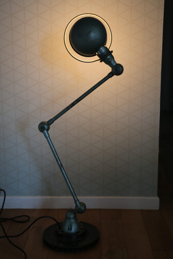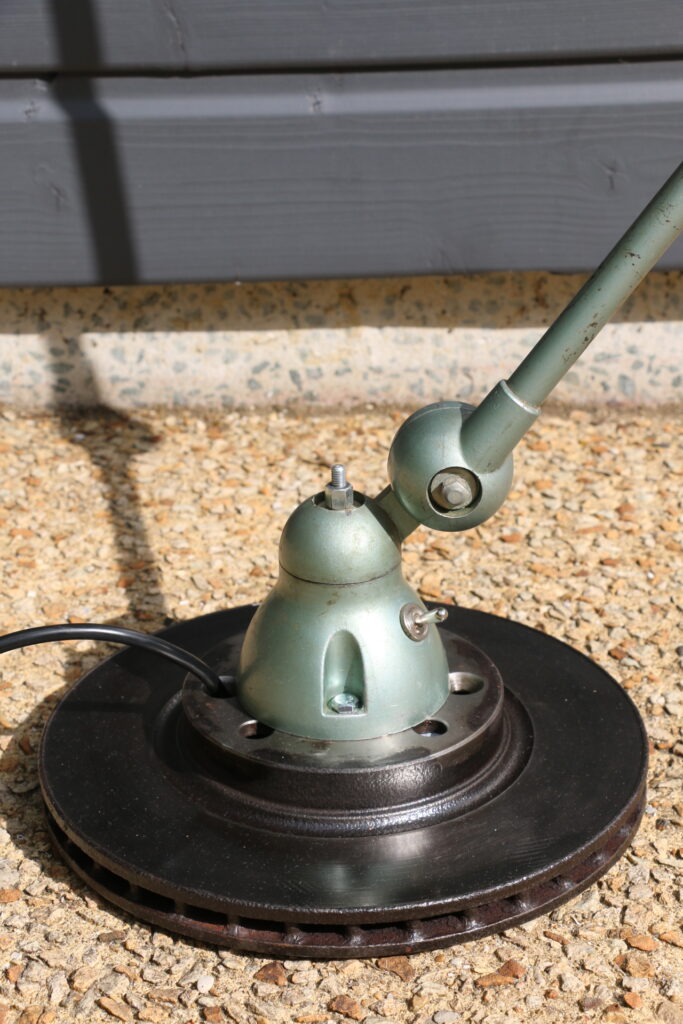 Plaque acier rivetée avec la marque sur le réflecteur et l’interrupteur « goutte d’eau » en acier sur la base du piètement