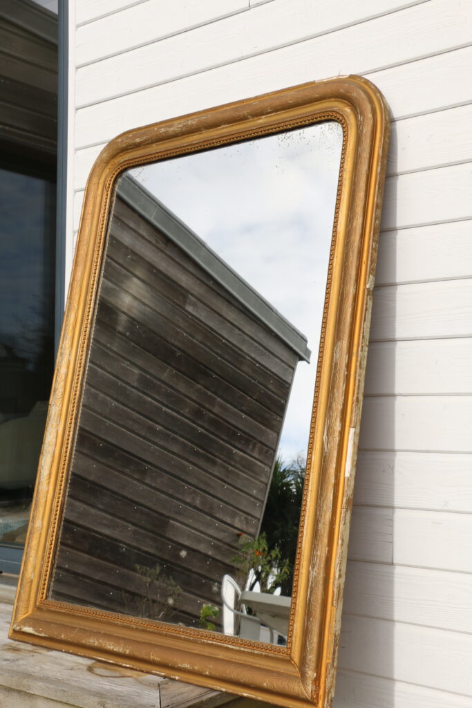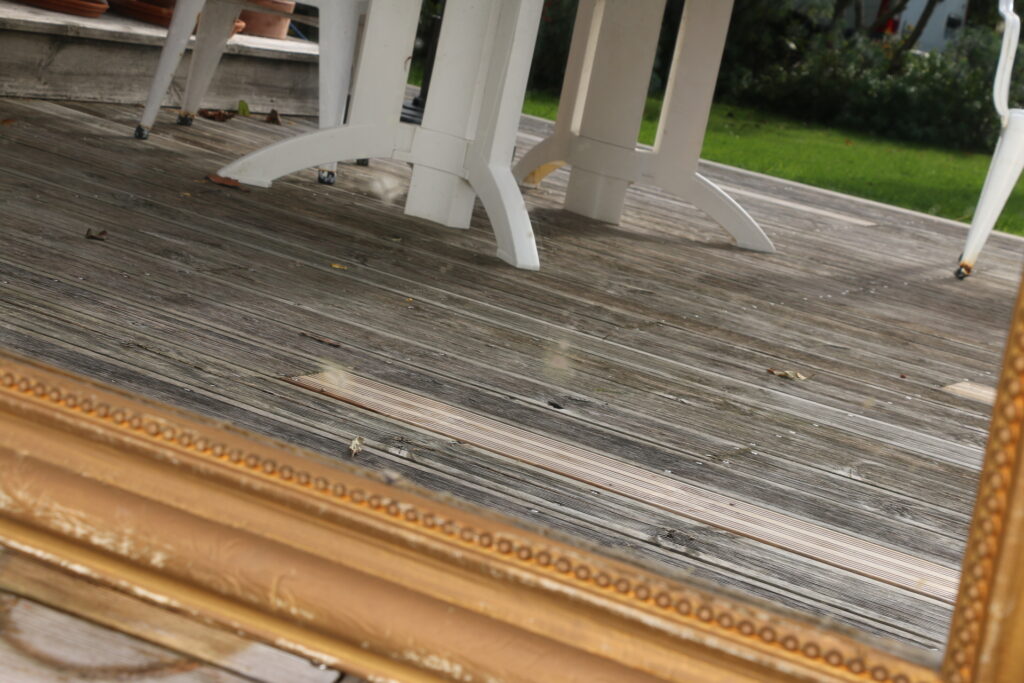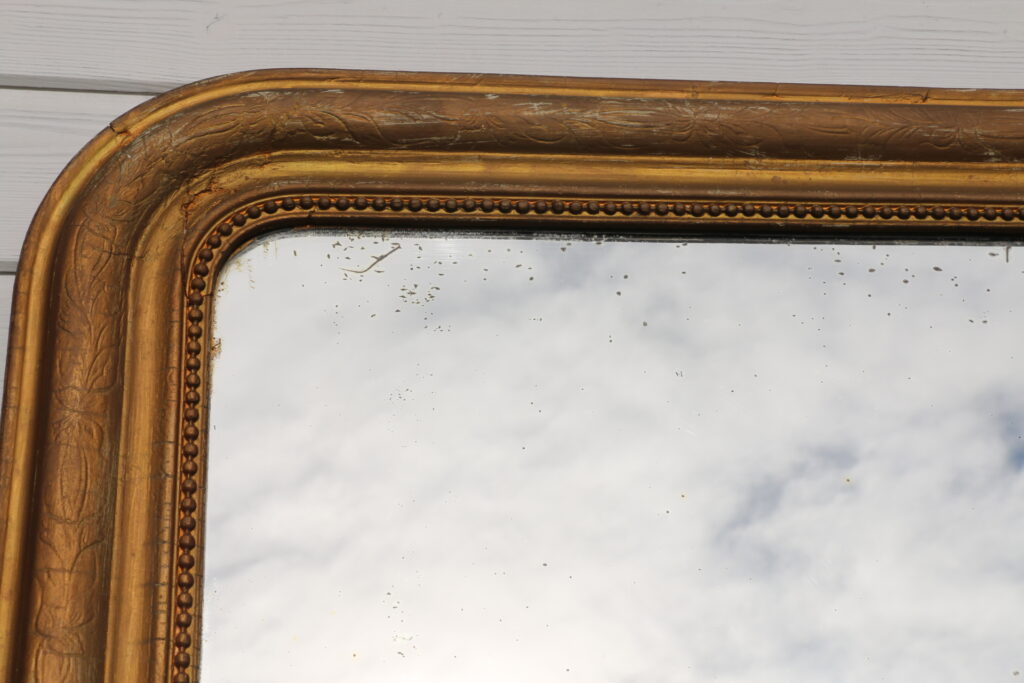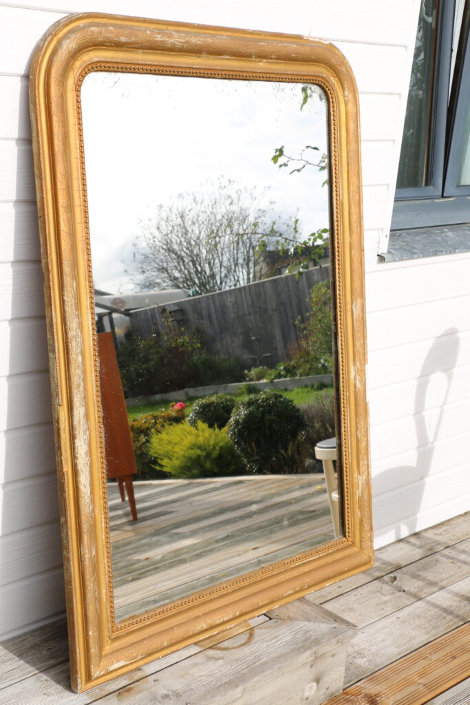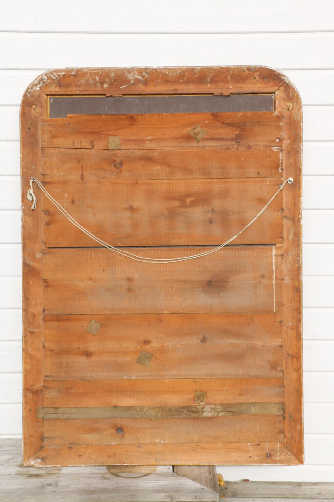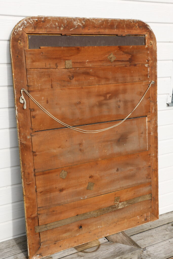 Forme rectangulaire de grande taille et de grande largeur ; glace ancienne en état correct présentant des piqures ; cadre présentant des imperfections (il présente des manques) ; parquet au dos avec une latte manquante