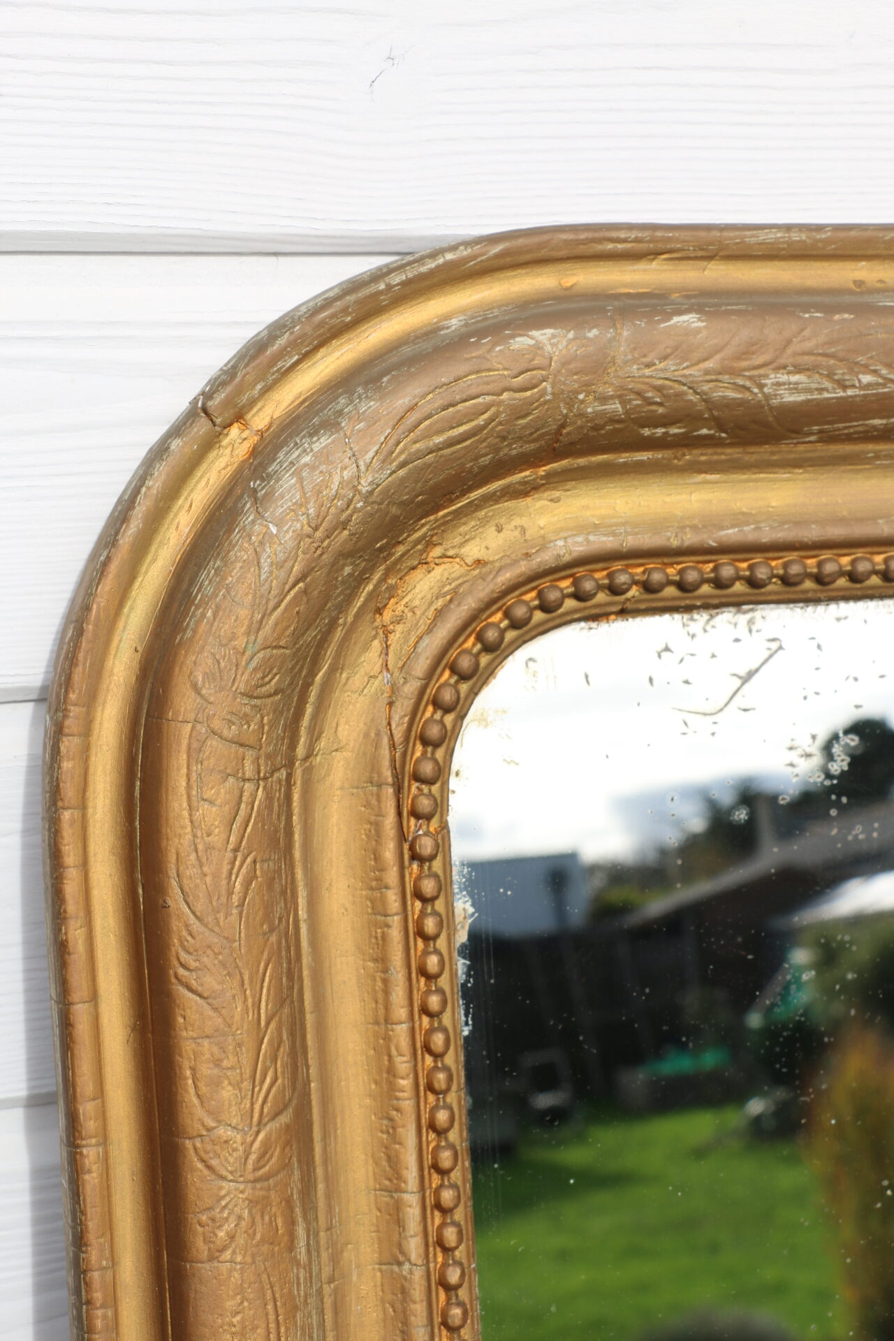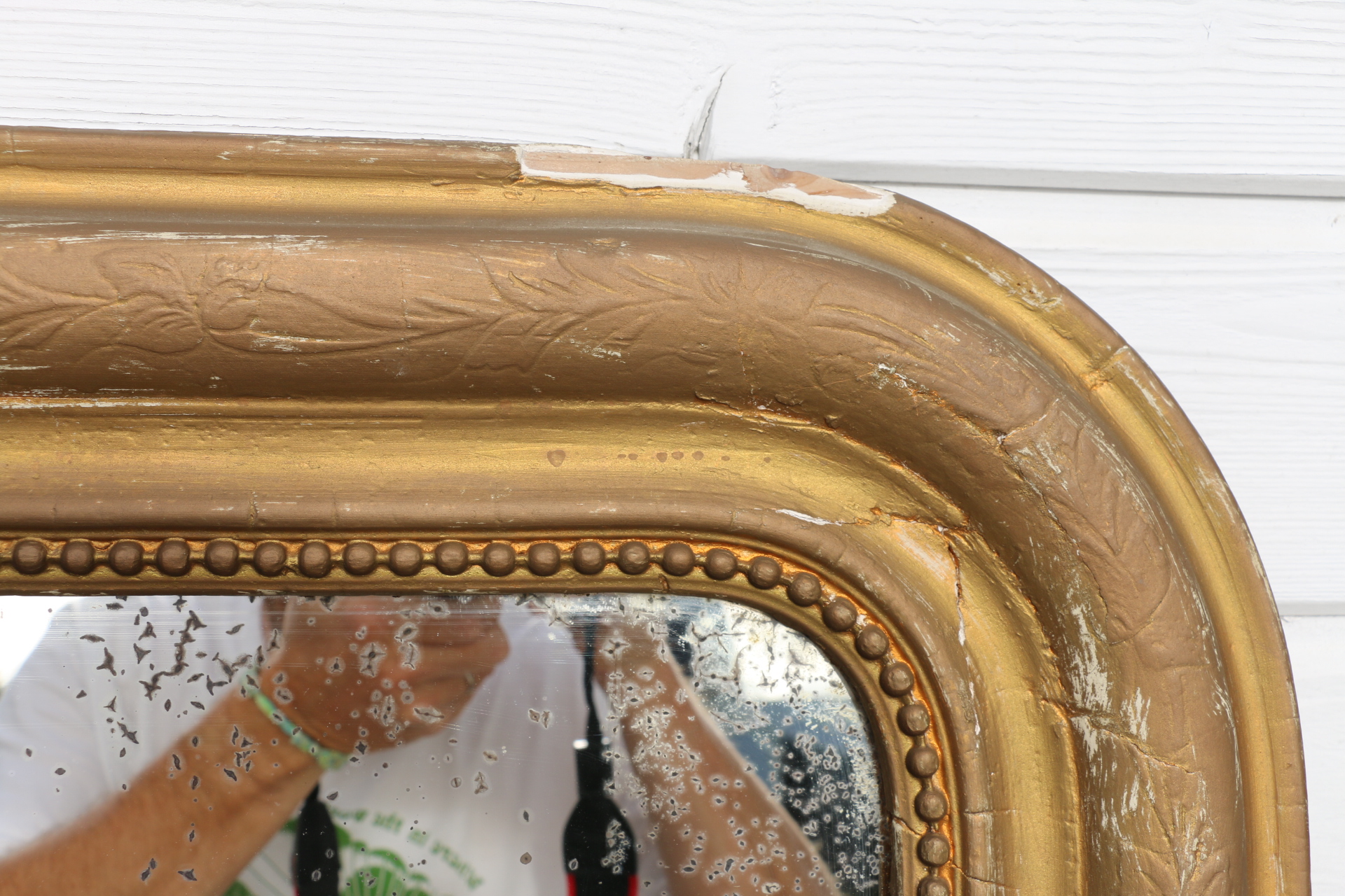 Forme rectangulaire de grande taille et de grande largeur ; glace ancienne en état correct présentant des piqures ; cadre présentant des imperfections (il présente des manques) ; parquet au dos avec une latte manquante