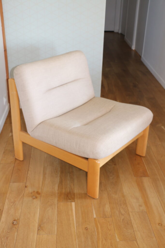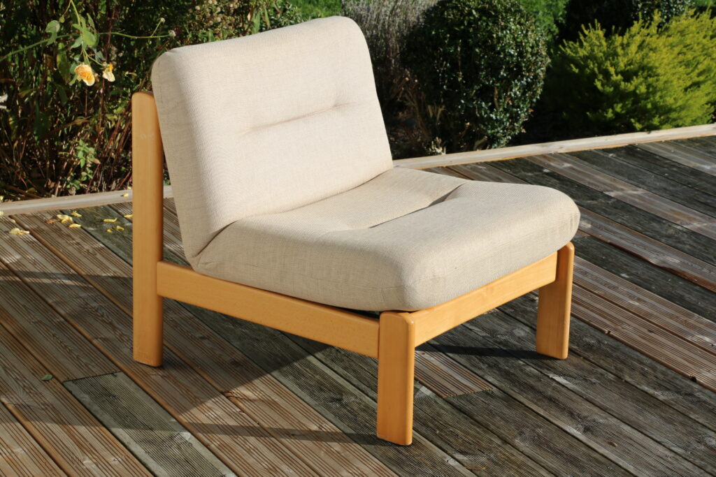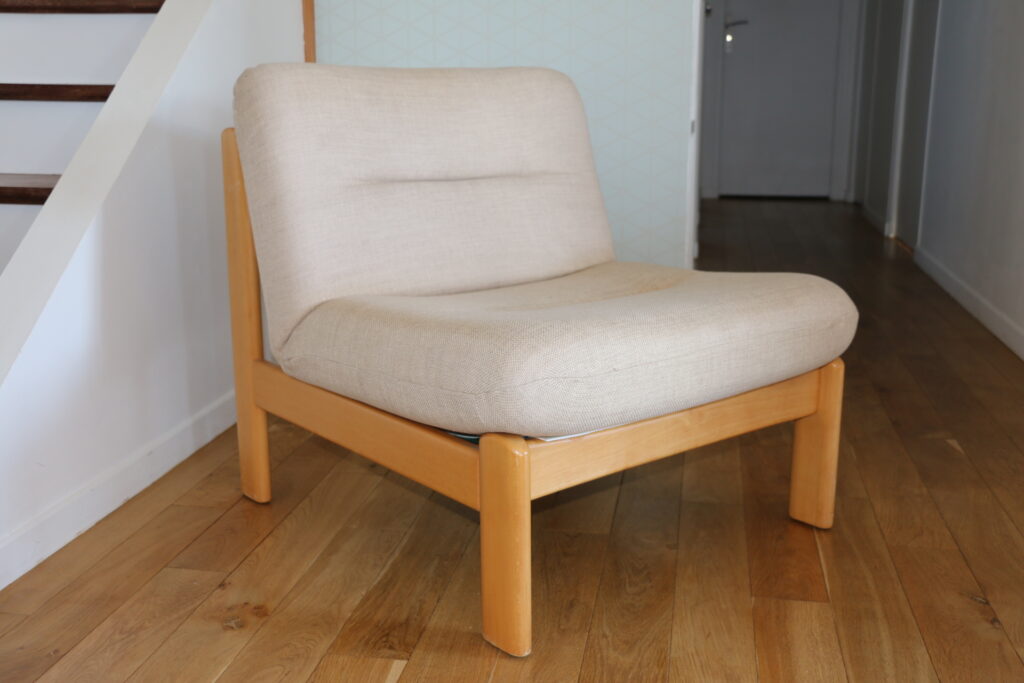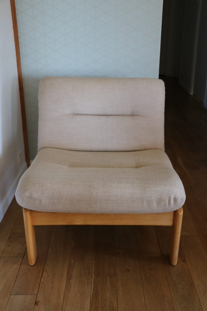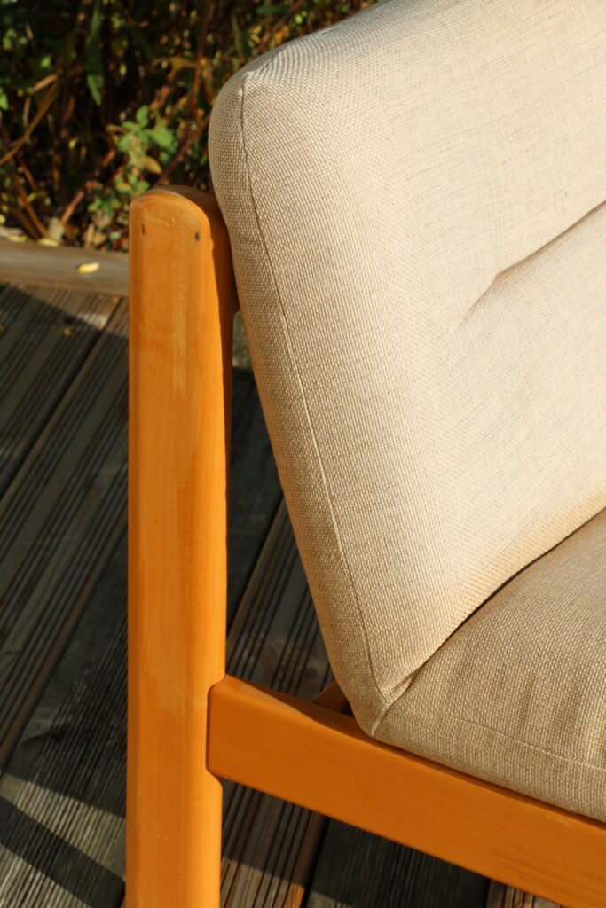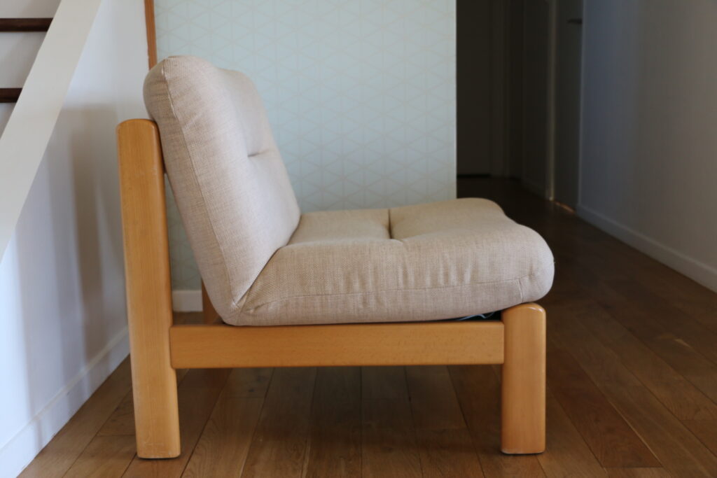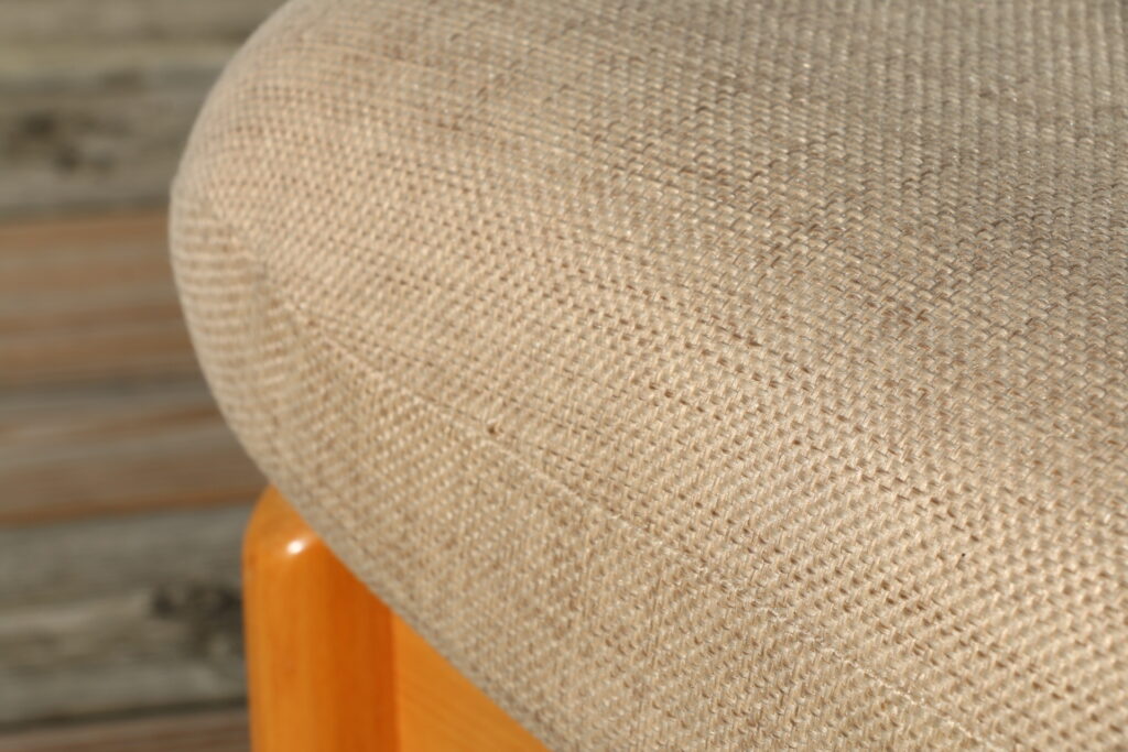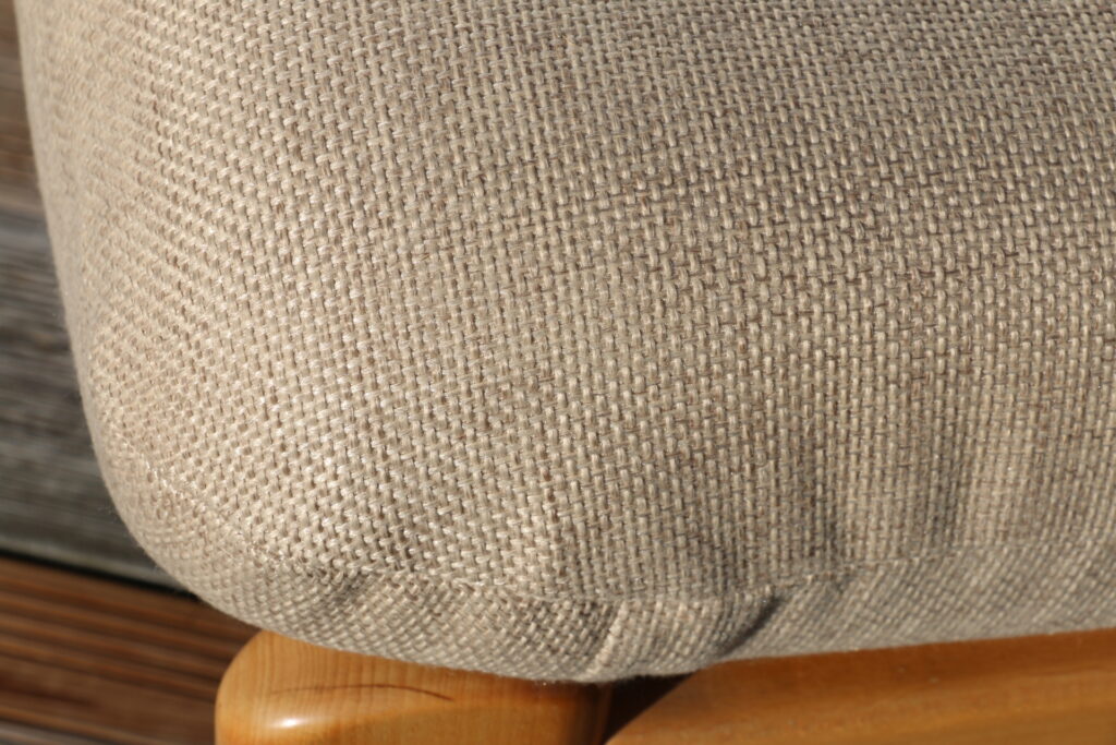 Structure en bois massif (probablement de l’orme) ; tissu et mousse avec fixation par bouton pressoir