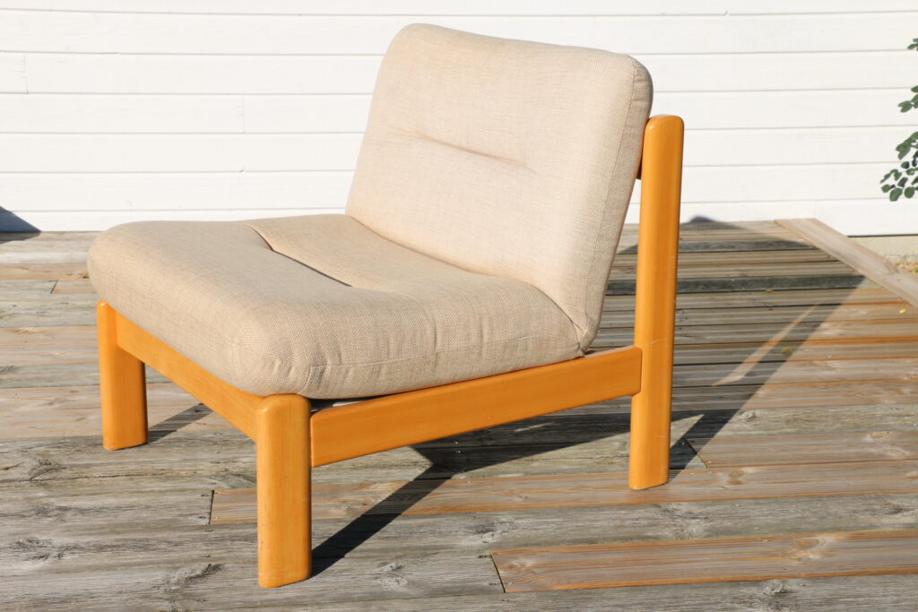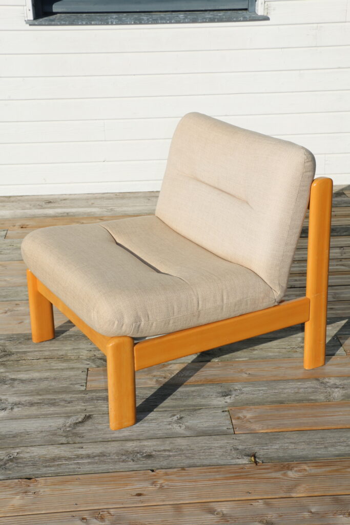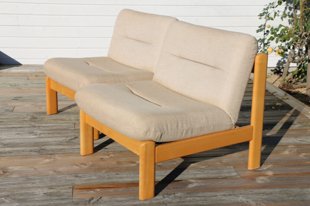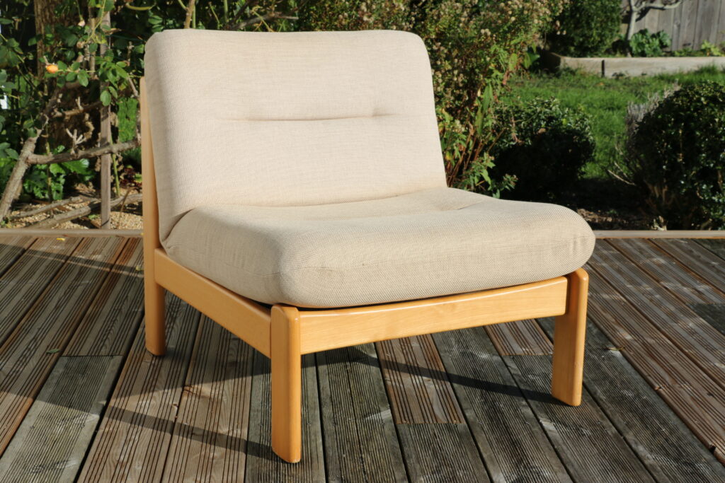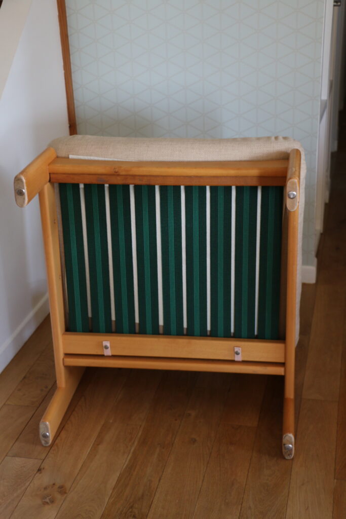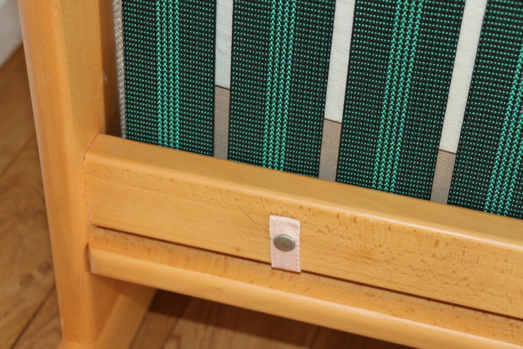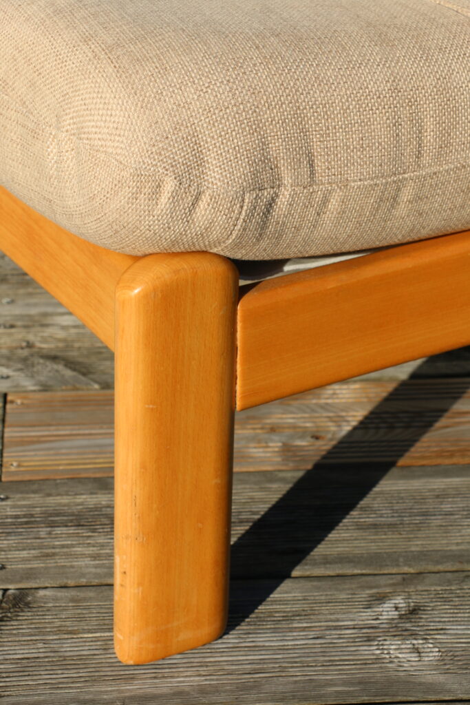 Structure en bois massif (probablement de l’orme) ; tissu et mousse avec fixation par bouton pressoir
