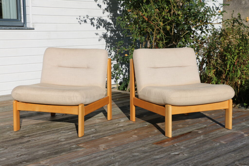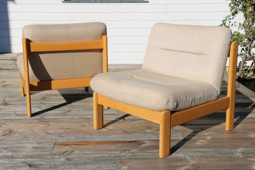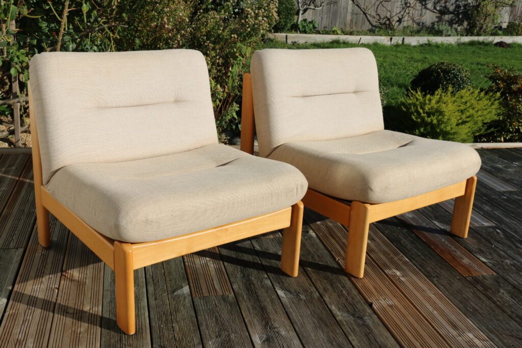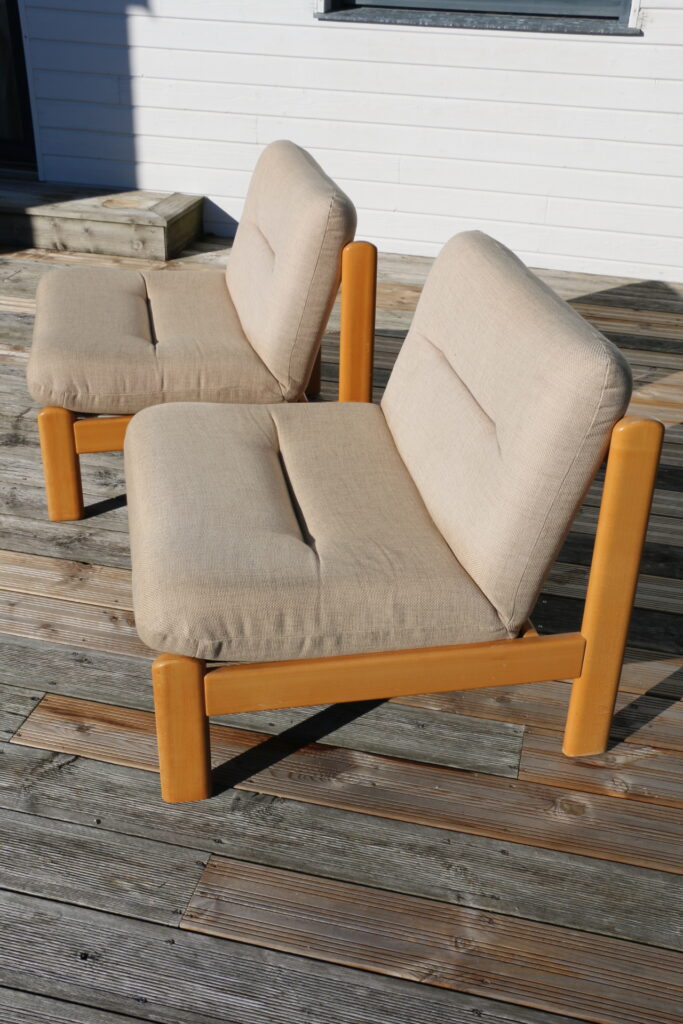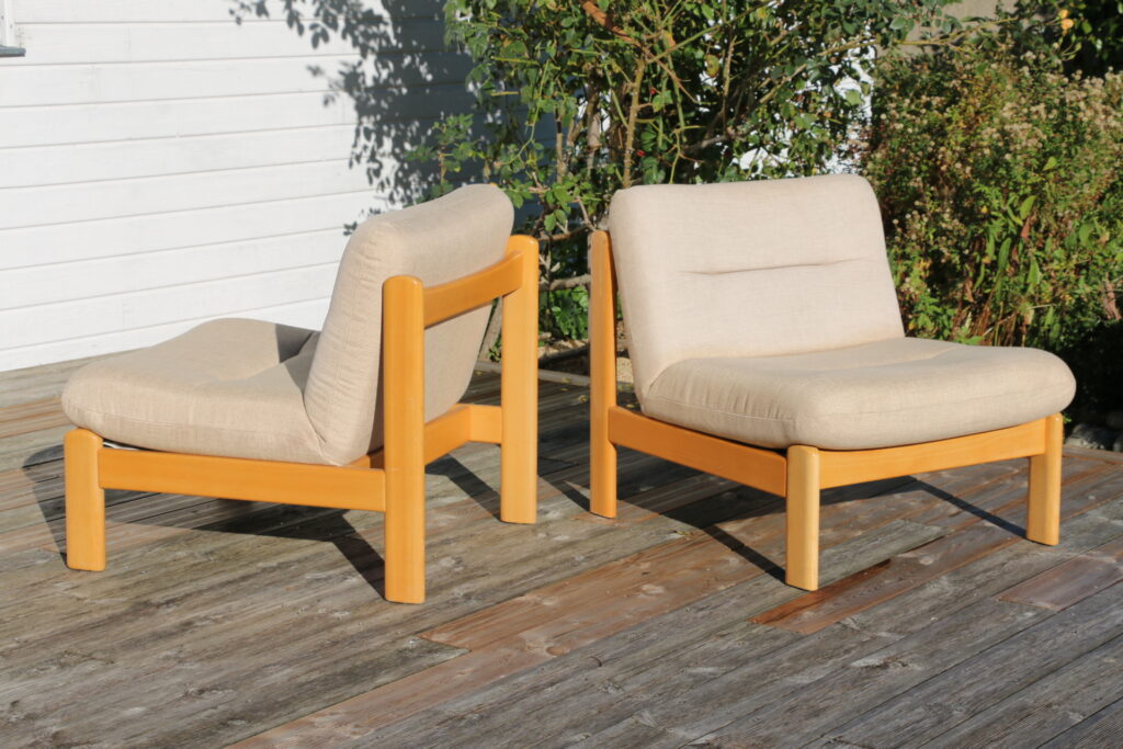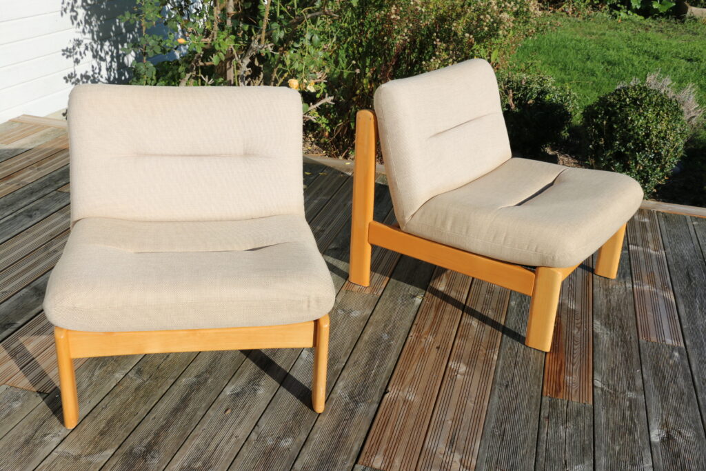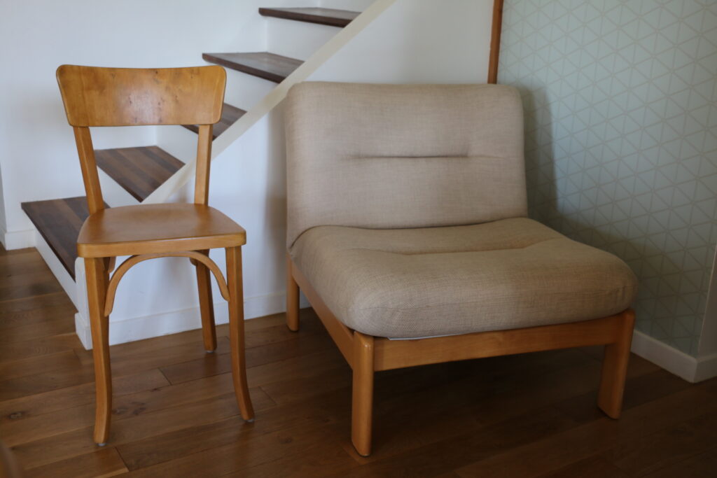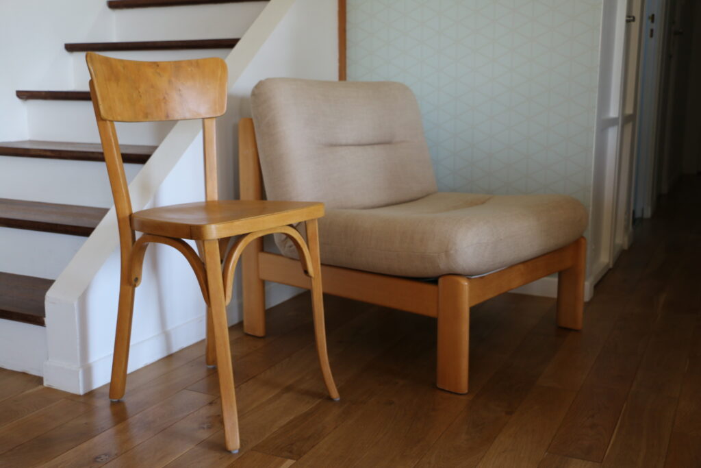 Structure en bois massif (probablement de l’orme) ; tissu et mousse avec fixation par bouton pressoir