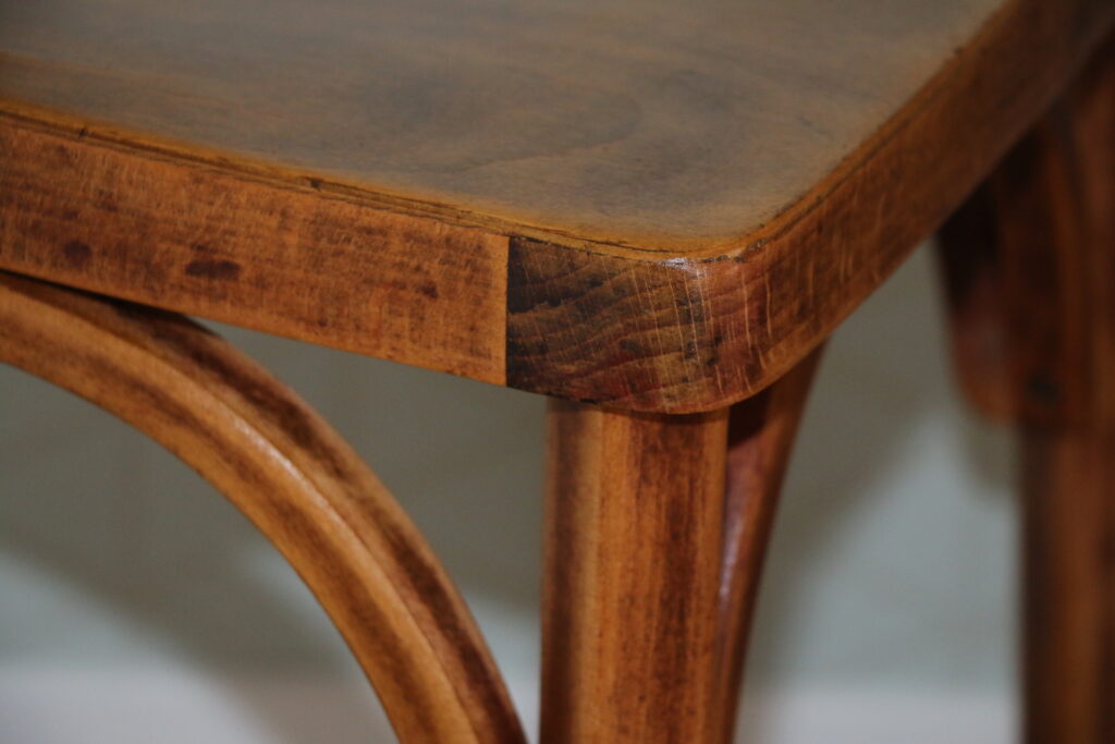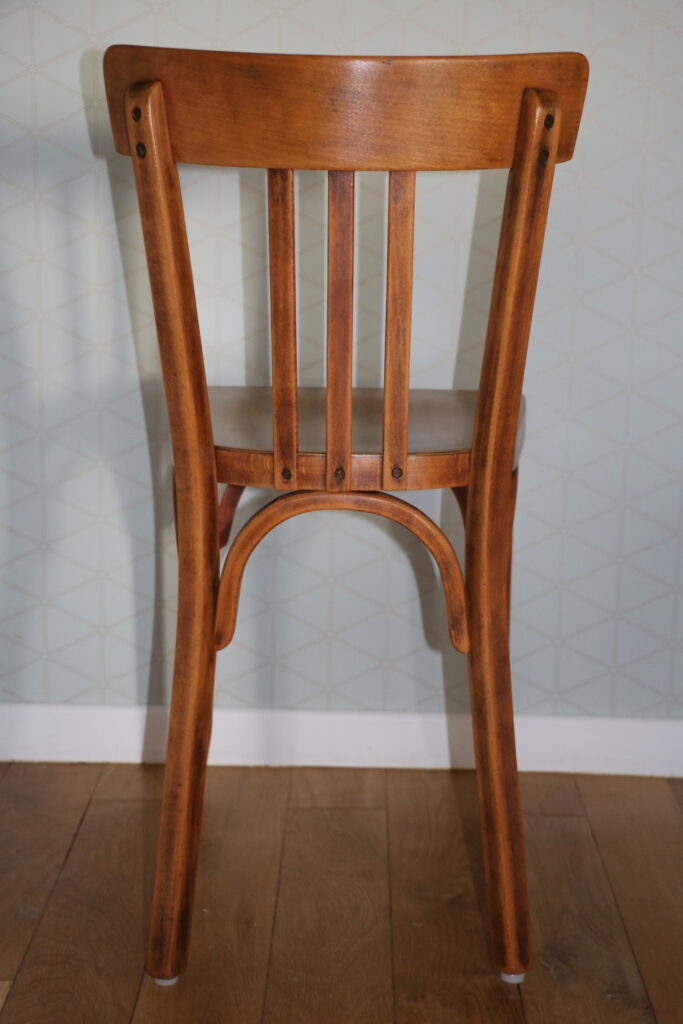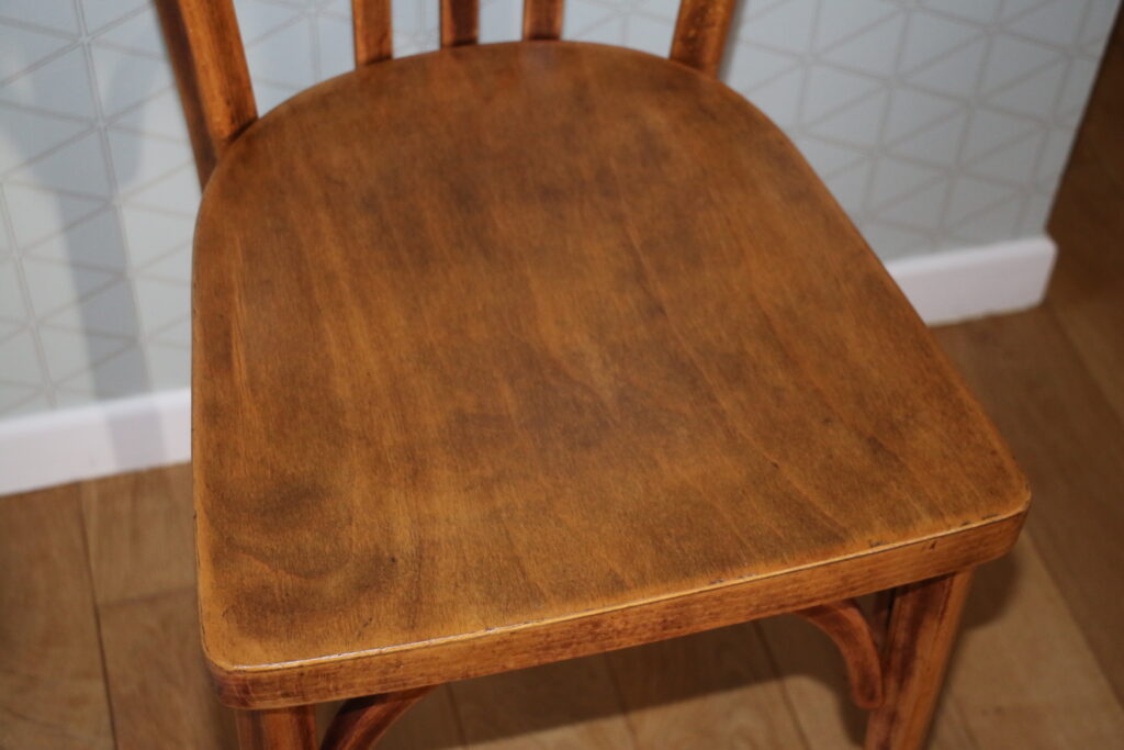 Très bon état structurel et cosmétique (belle patine ; chaises entièrement poncées puis protégées par un vitrificateur hêtre foncé) ; tampons piètement d’origine adaptés à toute surface
