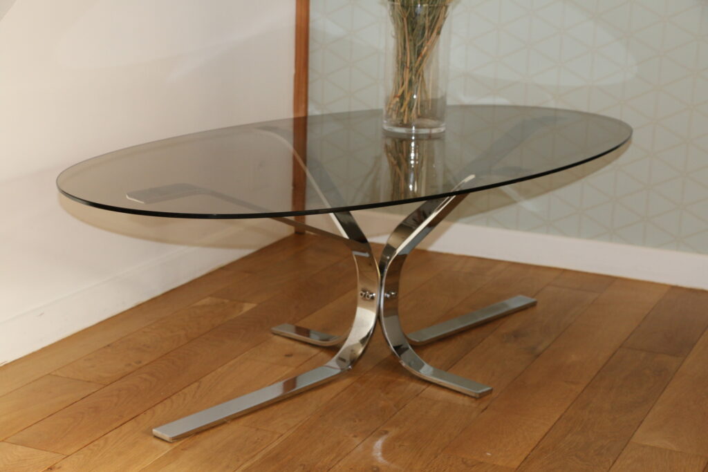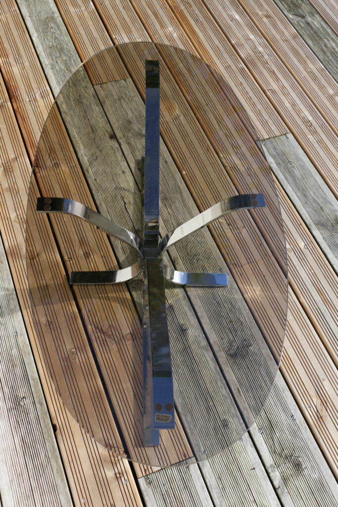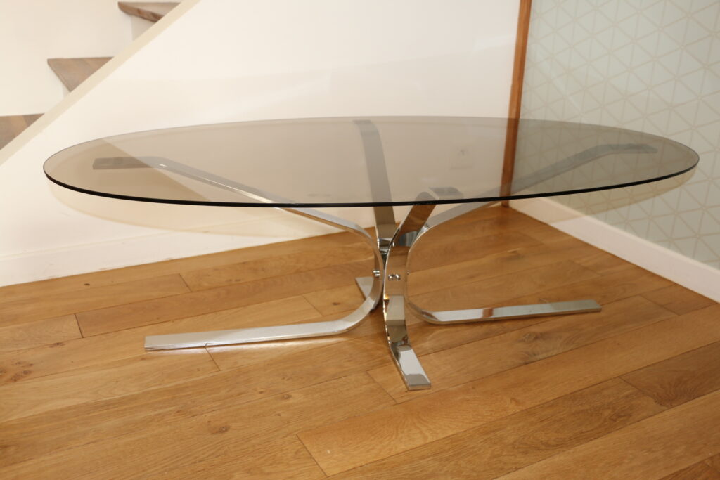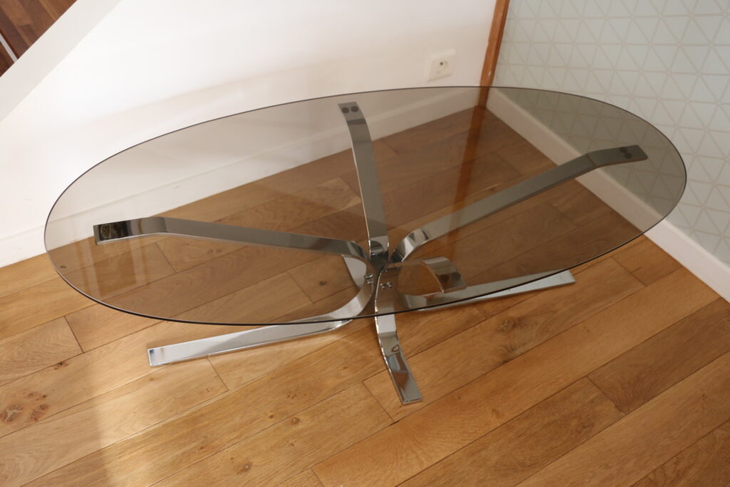 Structure acier chromé de belle facture ; plateau en verre fumé (posé sur la structure ; pas de fixation entre le plateau et la structure)