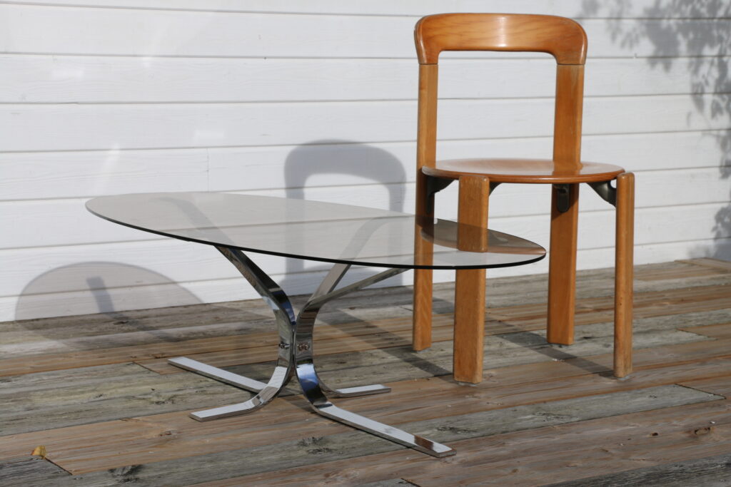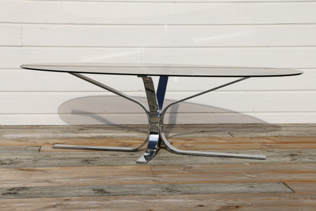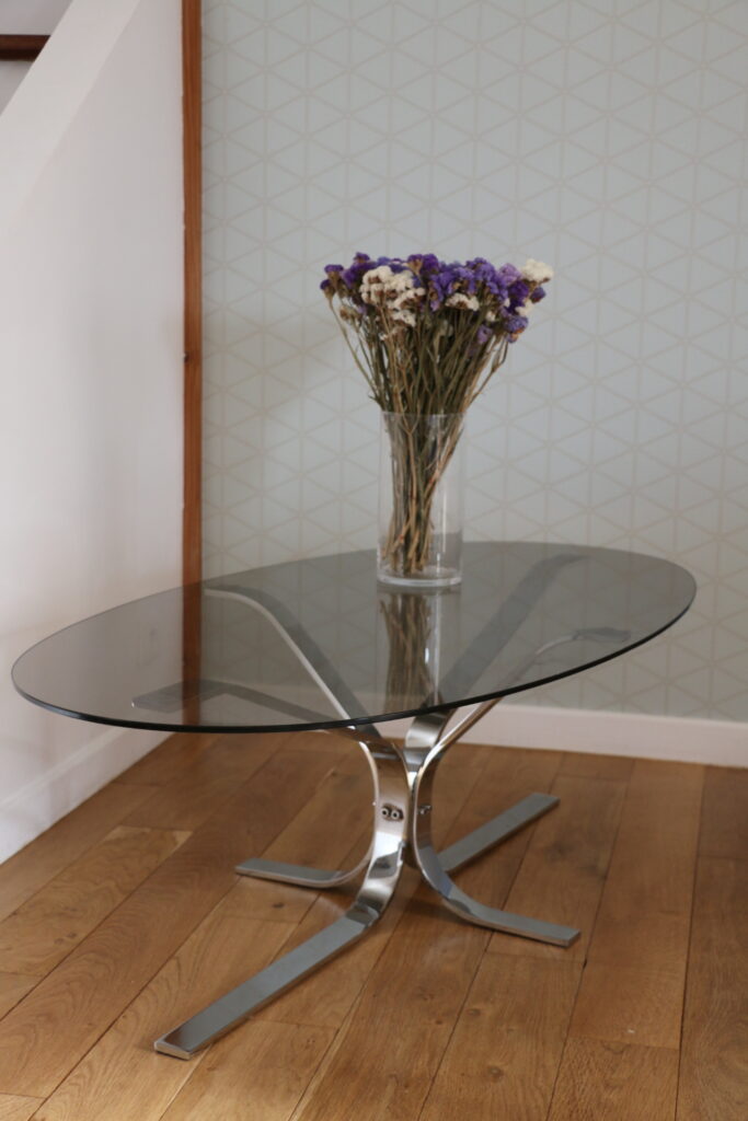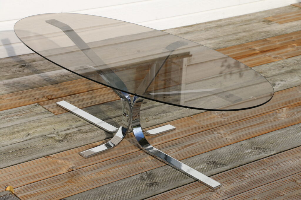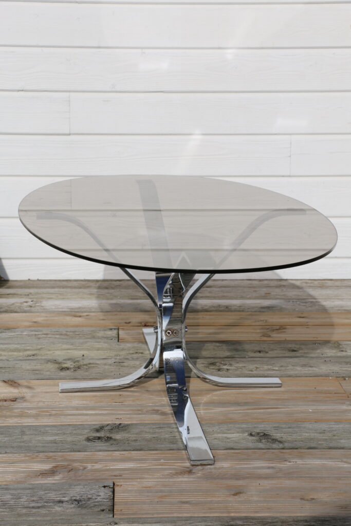 Structure acier chromé de belle facture ; plateau en verre fumé (posé sur la structure ; pas de fixation entre le plateau et la structure)