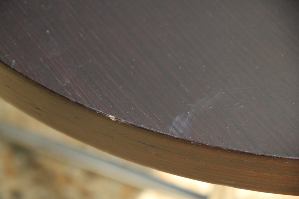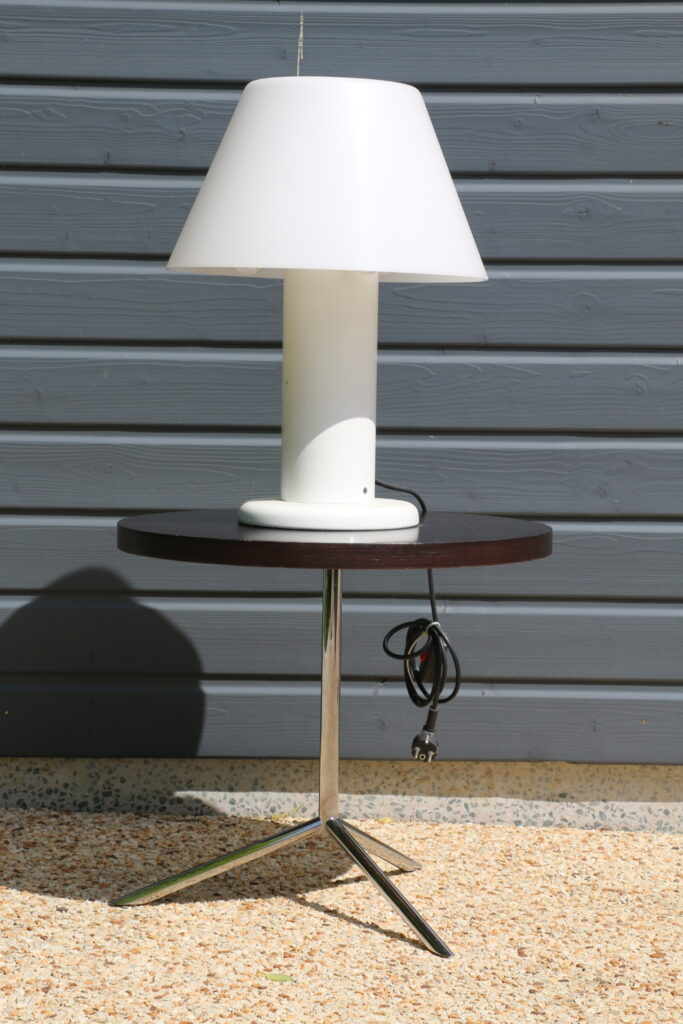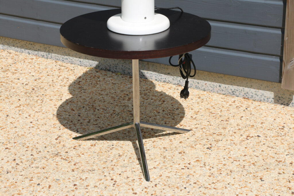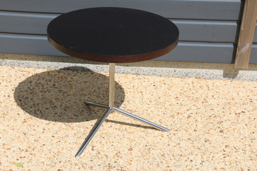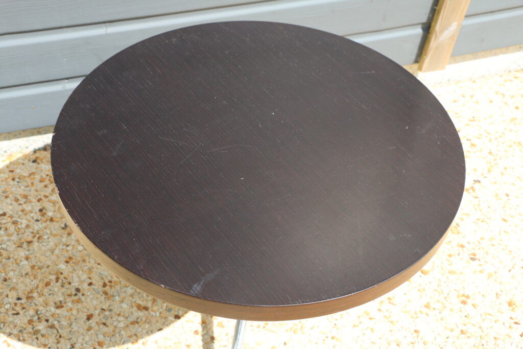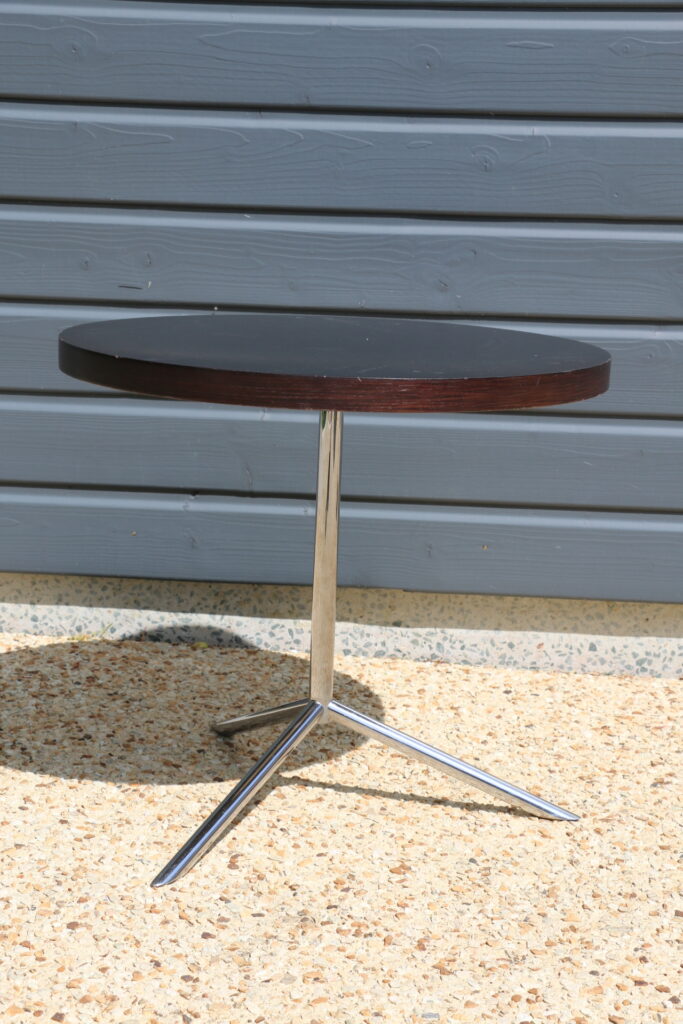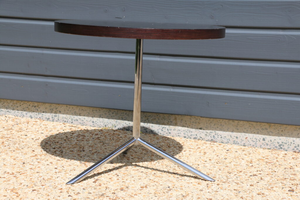 Piètement tripode en acier chromé ; plateau bois mélaminé plaqué